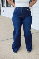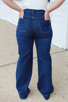 These dark wash wide-leg jeans feature a tailored 33" inseam, offering a polished yet relaxed fit. Crafted for an elevated silhouette, they balance modern style with comfort, making them a versatile choice for both casual and dressier occasions.