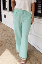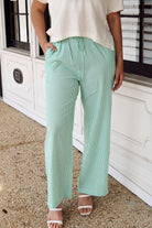 Elevate your wardrobe with these striking striped wide-leg pants in rich green. Designed with a high-rise elastic waist and adjustable drawstring detail, they offer both comfort and a flattering silhouette. The relaxed wide-leg cut creates an effortlessly chic look perfect for casual outings or dressed-up occasions. Versatile and on-trend, these pants are a must-have staple for any fashion-forward closet.