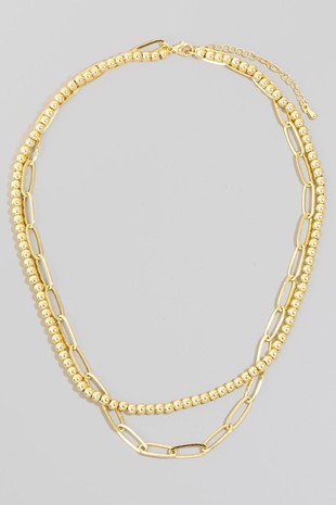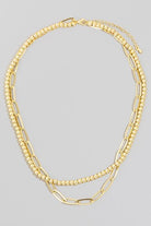 This gold dipped beaded and chain layered necklace seamlessly combines modern and classic styles, effortlessly enhancing any outfit. With a subtle yet eye-catching design, this necklace is the perfect accessory for any occasion. Experience the elegance and sophistication of this stunning piece.