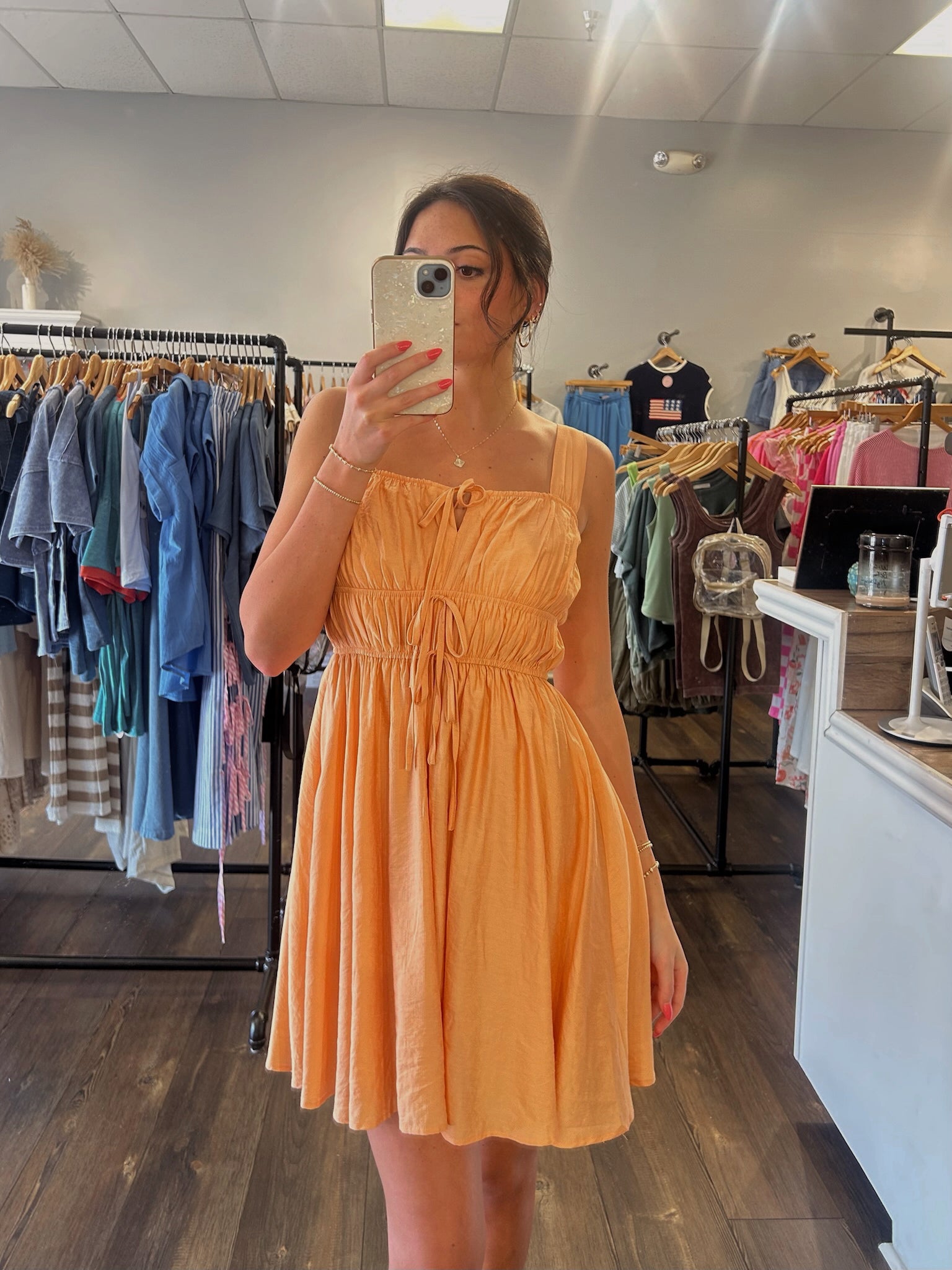 This apricot mini dress has a flattering square neckline and wide straps, perfect for any occasion. The front self-tie and keyhole detail add a touch of charm, while the gathered shirred waist provides a comfortable and flattering fit. Made with a soft and durable blend of rayon and nylon, and fully lined with 100% polyester. Look and feel beautiful in this solid colored mini dress.