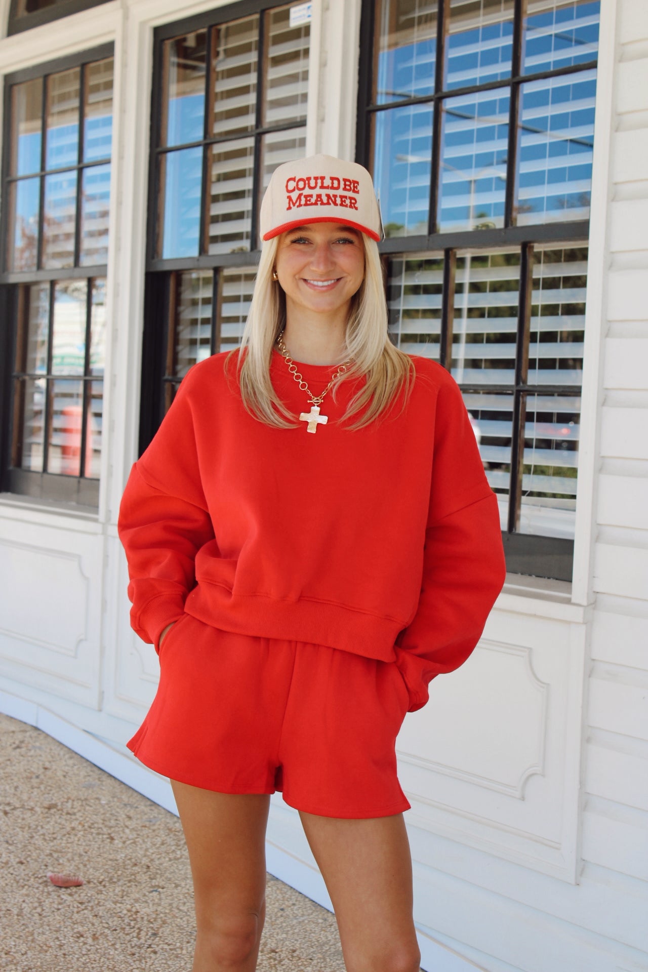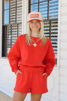 Get ready for apple picking or cherry chasing in total comfort with this playful set! Featuring cozy fleece micro sweatshorts with handy side pockets, you'll stay snug without sacrificing style. The oversized crewneck sweatshirt wraps you in warmth and effortless cool, perfect for crisp fall days. Whether you’re strolling through orchards or lounging at home, this set brings cozy vibes and carefree fun to your wardrobe.