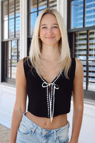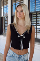 The Ava Top in Black features a refined knitted design with a stylish front tie accented by a Cream ribbon lace. This combination offers both texture and adjustable fit, making it a versatile piece that blends subtle sophistication with contemporary detail. Ideal for layering or as a standalone statement, it elevates any outfit with expert craftsmanship and thoughtful design.