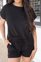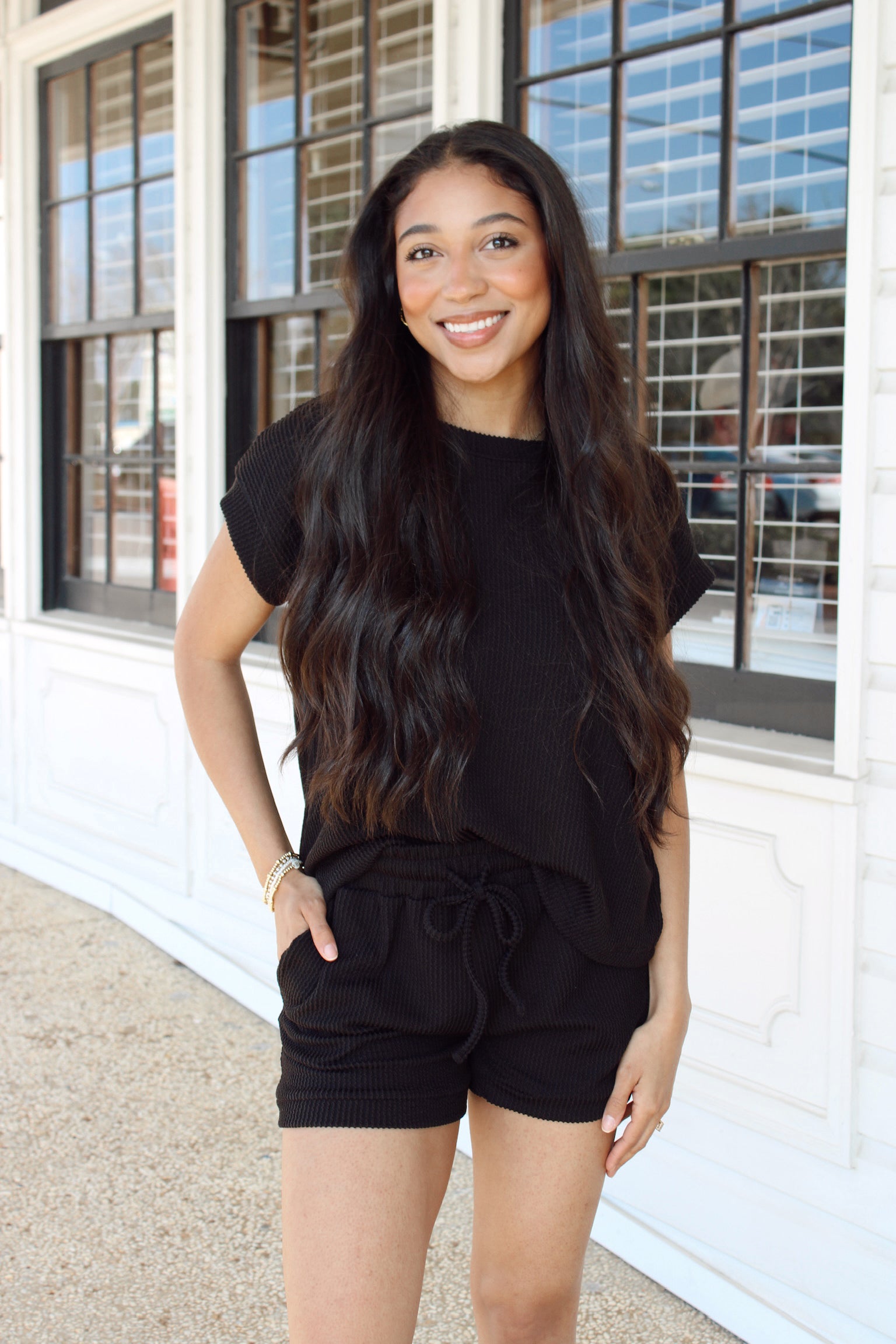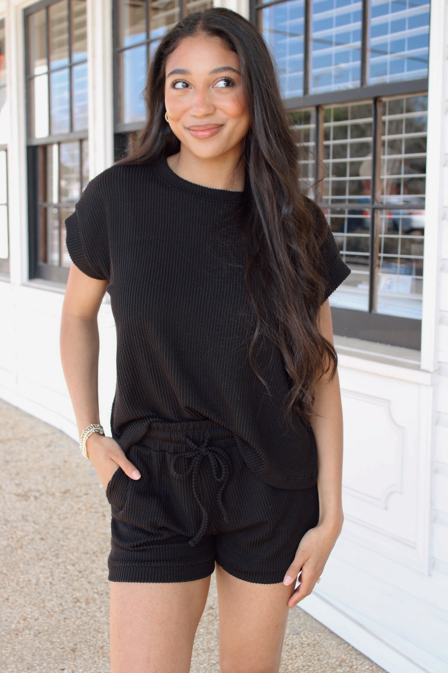 This ribbed set is your new best friend! The cap sleeve top features a flattering round neckline and textured raised ribs that add dimension and visual interest, while the coordinating shorts deliver comfort with a bonus pocket. Throw them on together for a coordinated look, or style each piece separately for maximum versatility. Whether you're relaxing at home or stepping out for the day, this set keeps you looking chic and feeling great.