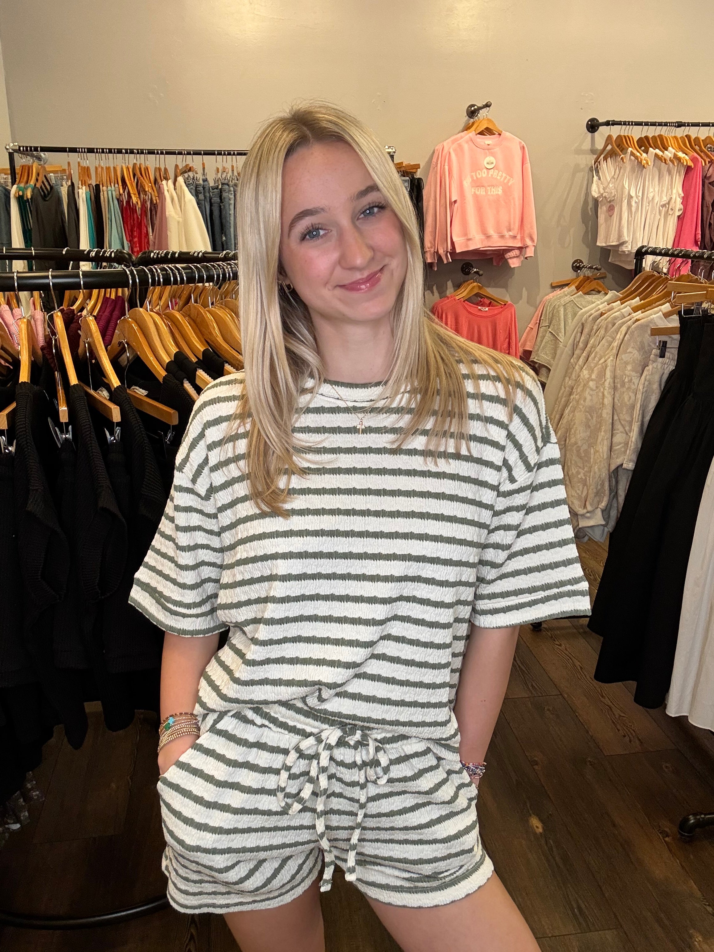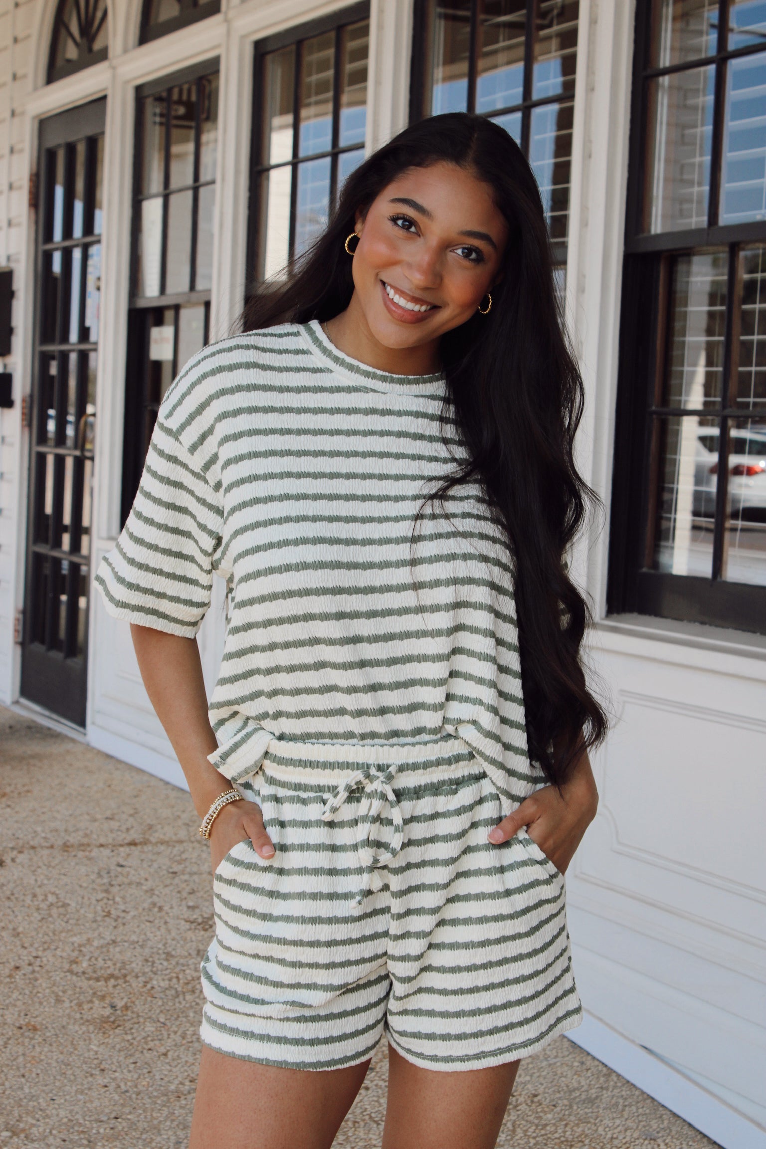 Call Me Striped Shorts Set: Olive