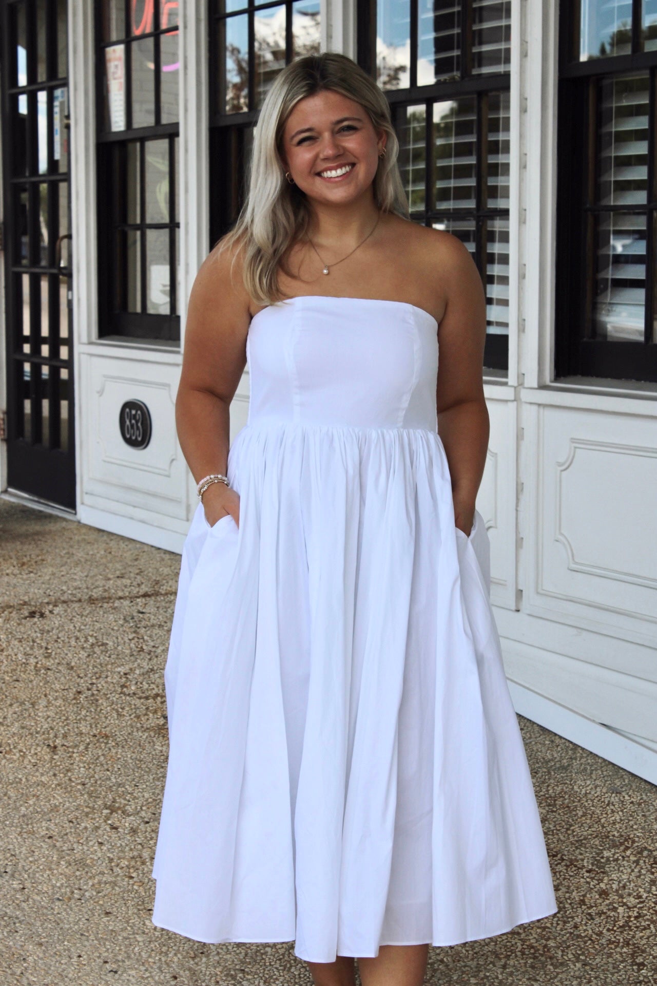 This playful white midi tube dress features delicate pleats that add a flirty texture and effortless movement. Its figure-hugging silhouette is perfect for turning heads at any event, blending comfort with chic style in one easy piece.