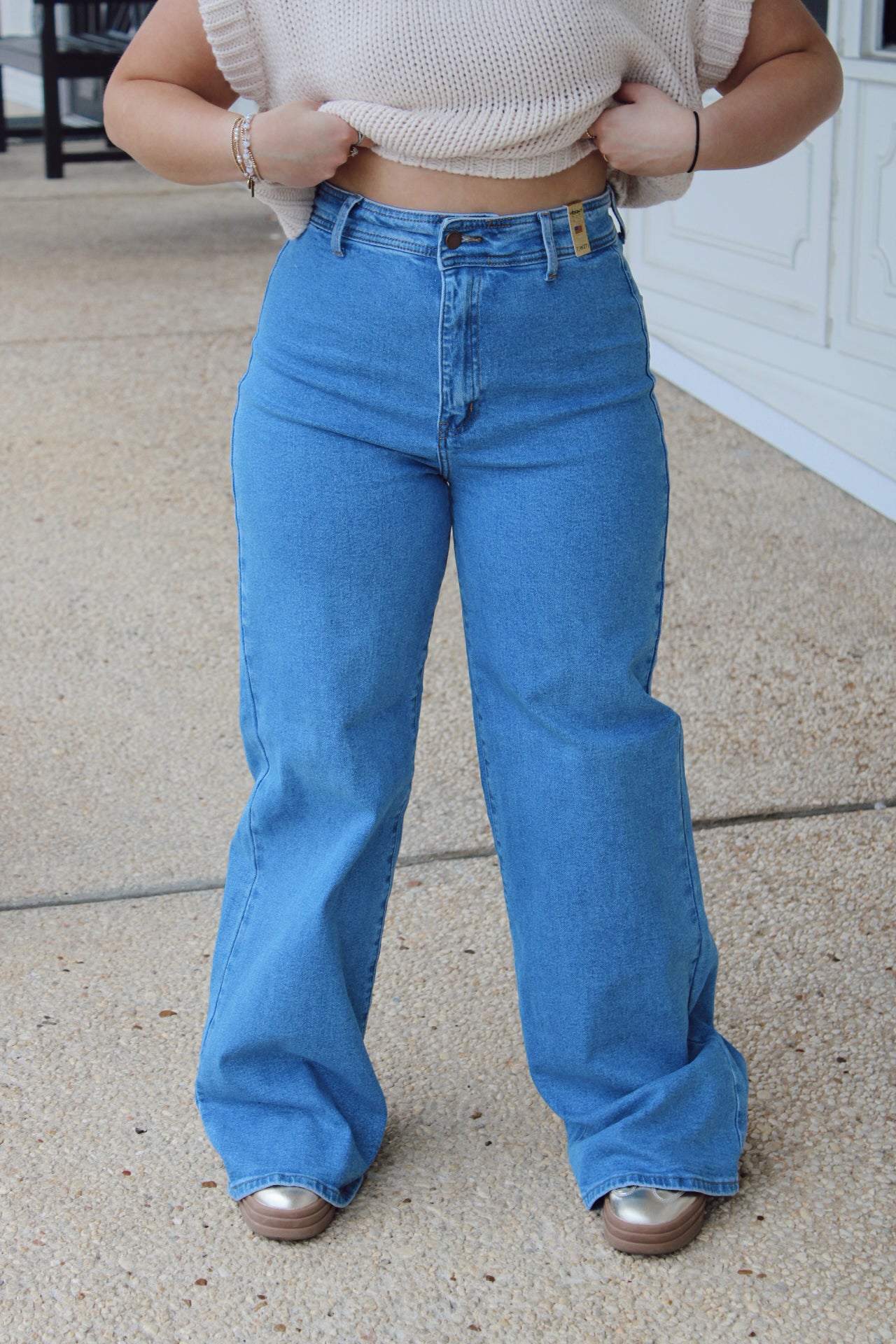 These high-rise wide jeans are built to make a statement. With a flattering silhouette that elongates your frame, they feature classic two back pockets for practicality and a reliable zip-fly closure for easy wear. The medium stone wash gives them that effortlessly cool vibe—perfect for pairing with everything from crop tops to oversized blazers. Go strong in denim that actually works as hard as you do.