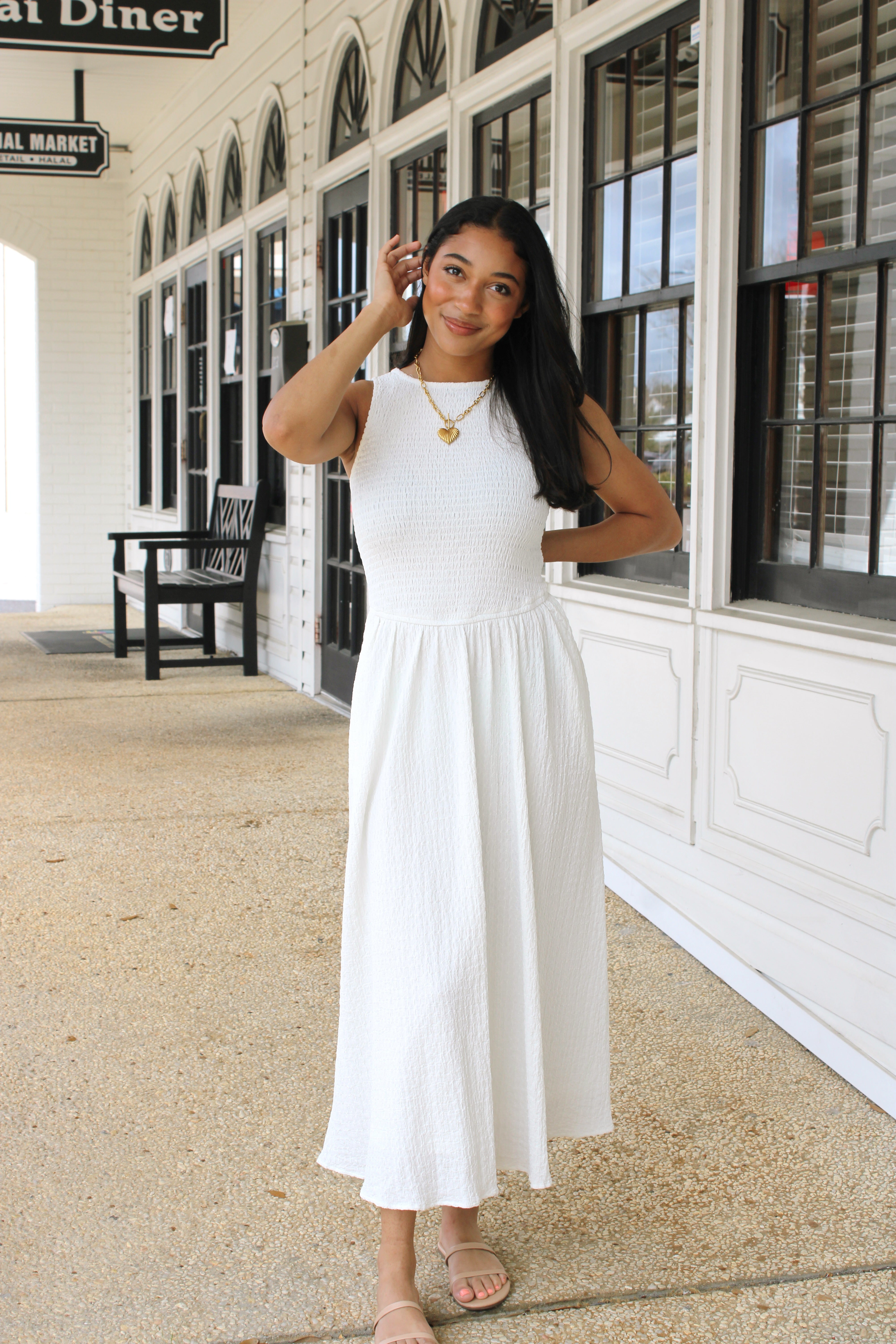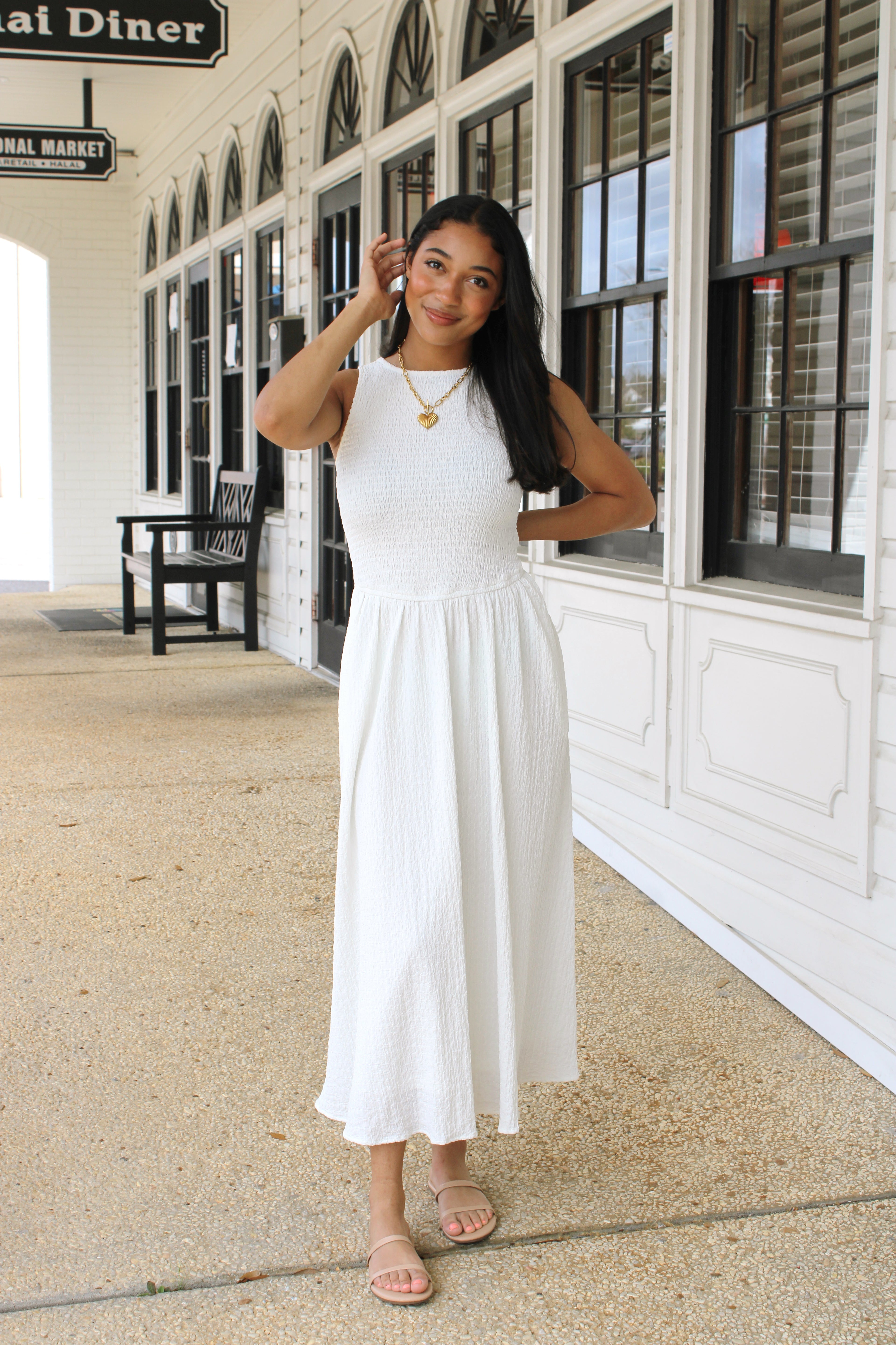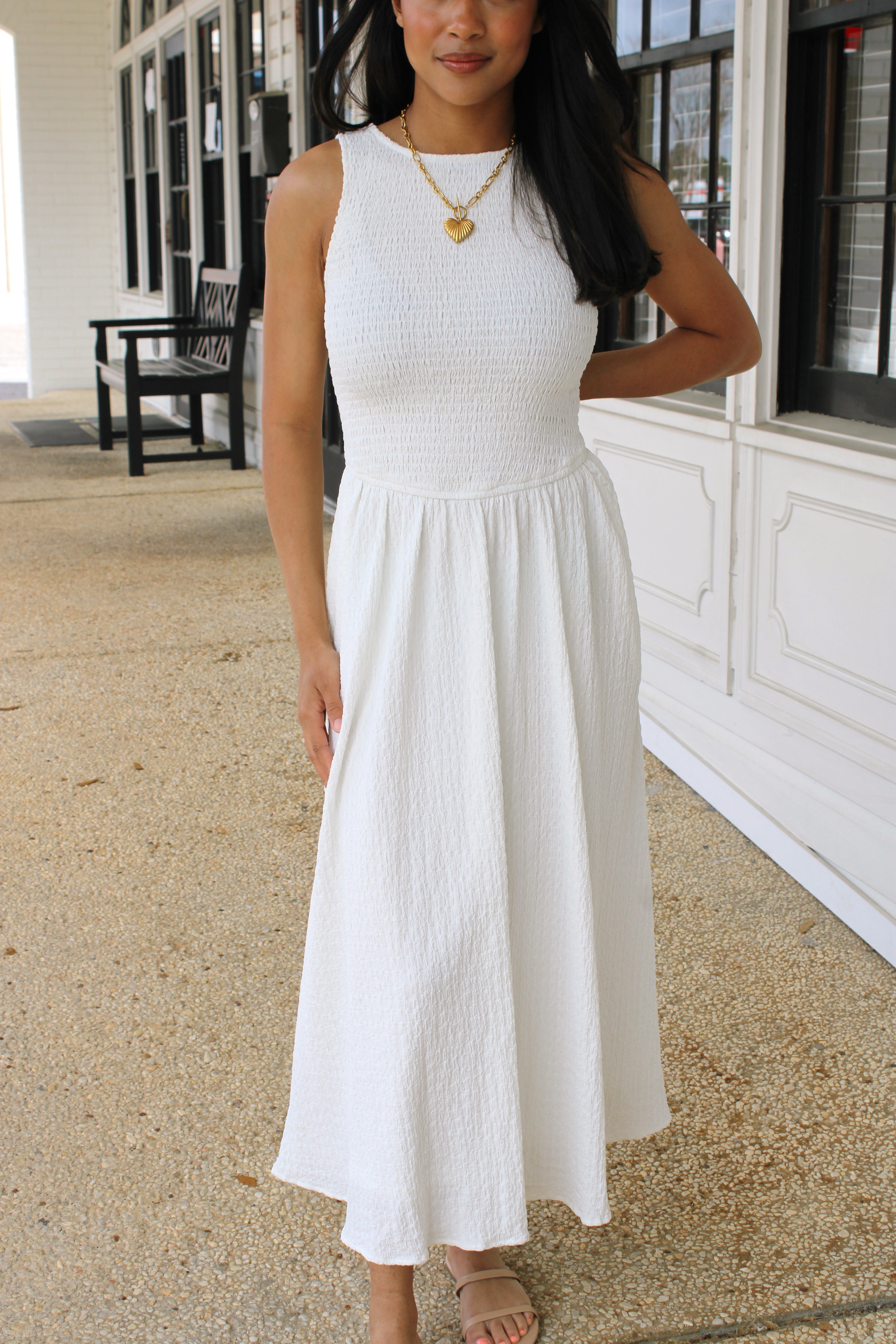 Effortless elegance meets laid-back charm in this off-white smocked sleeveless dress. The textured fabric adds visual interest and dimension, while the smocked detailing creates a flattering, gathered silhouette that moves with you. Perfect for breezy days at the beach, casual brunches, or sunset strolls through town. Slip it on and feel instantly put-together without trying too hard.