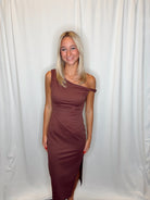 Turn every moment into something special with this elegant twisted shoulder midi dress in warm brown. The distinctive shoulder detail creates an eye-catching focal point that sets this piece apart, offering a modern twist on classic femininity. The midi length provides sophisticated coverage while maintaining a graceful, flattering silhouette that works for various occasions—from brunch dates to evening events. The rich brown tone is endlessly versatile, pairing effortlessly with neutral accessories or bold statement pieces to match your mood. The thoughtful design details prove that you don't need complicated patterns or heavy embellishments to make an impact. Invest in a dress that combines understated elegance with memorable style, and discover why this piece becomes an instant favorite in your rotation.