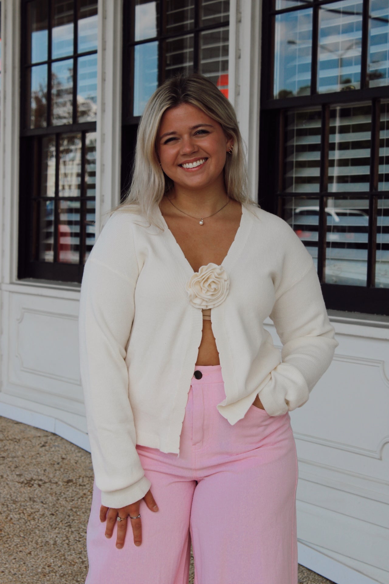 Add a whimsical touch to your wardrobe with this open knit cardigan featuring a charming detachable 3D rosette brooch you can pin wherever you like. Its deep V neckline and ruffle-trimmed edges bring a flirty vibe, while the lightweight knit makes it perfect for layering or wearing buttoned-up as a standout top. A playful mix of classic and creative, this cardigan brightens any outfit with ease.