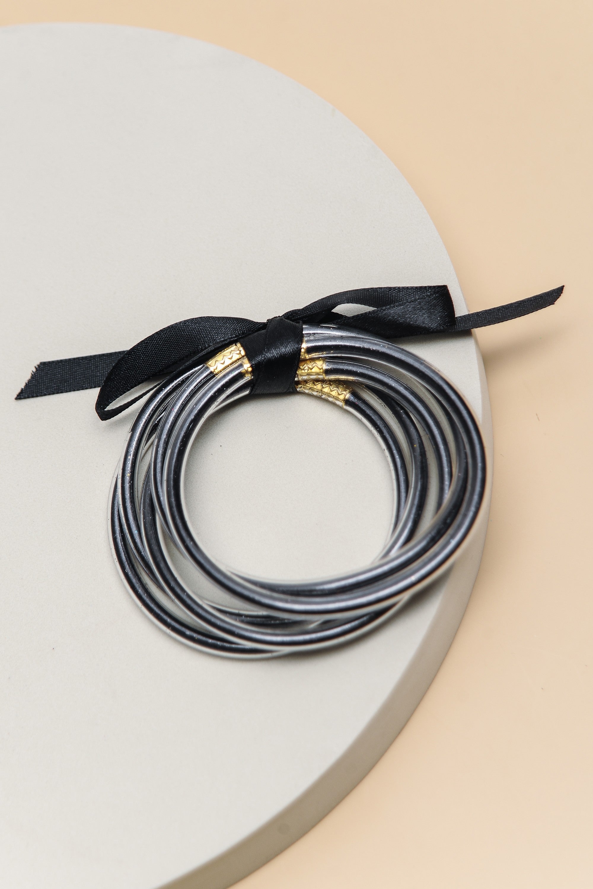 Stack these five shimmering jelly bangles for instant sparkle without the jingle! Each bangle is feather-light and completely silent, so you can layer them freely without any clinking sounds. Waterproof and durable, they're perfect for everyday wear, beach days, or pool parties. Mix and match the glittery hues to match your mood and style. Fun, flexible, and fuss-free—the ultimate accessory for adding a touch of shimmer to any look!