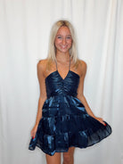 Slip into effortless elegance with this navy satin stunner. The ruched V-neckline flatters your silhouette while the multi-tiered halter design adds drama and dimension. Perfect for date night, cocktail hour, or whenever you want to feel absolutely fabulous. This mini dress proves that good things really do come in small packages—and looking this good has never been easier.