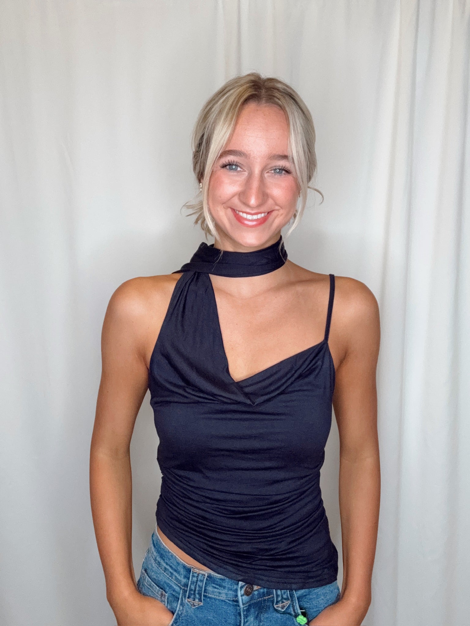 Throw on effortless style with this one-shoulder knit top that comes complete with an attached scarf—no extra layering required. The navy hue pairs with everything, while the asymmetrical neckline adds just enough edge to keep things interesting. Perfect for those days when you want to look put-together without the fuss. Cozy, chic, and ready to go.