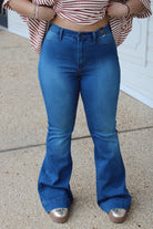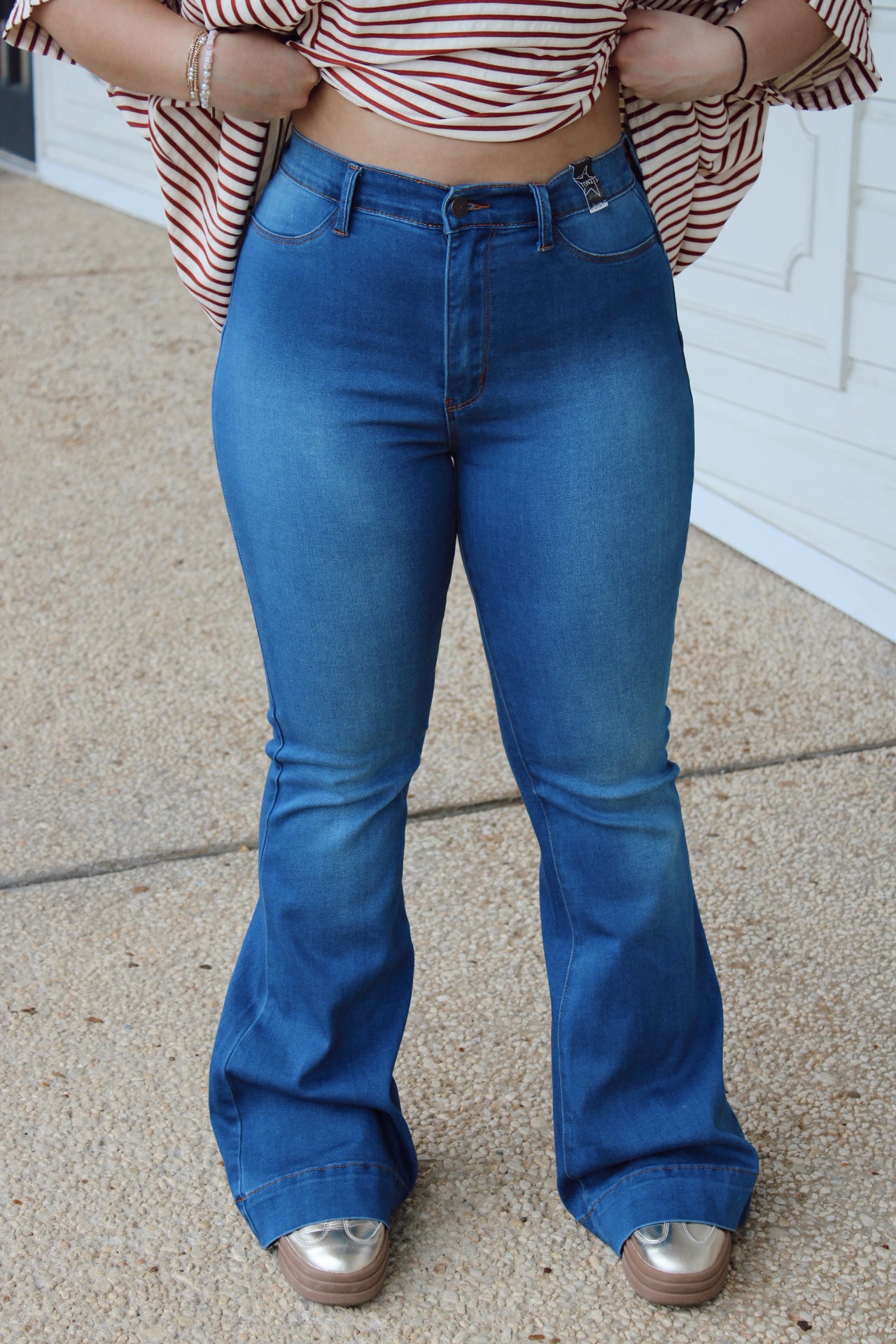 Rock that retro vibe with these Own The Look Jeans in medium stone. High-rise flare silhouette pairs perfectly with the signature doubled cuff detail for serious '70s energy. Functional front and back pockets keep your essentials close, while the zip-fly closure ensures a secure fit. Whether you're channeling vintage cool or making a bold fashion statement, these jeans deliver style that turns heads.