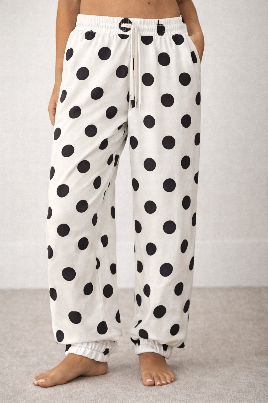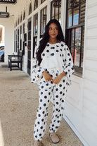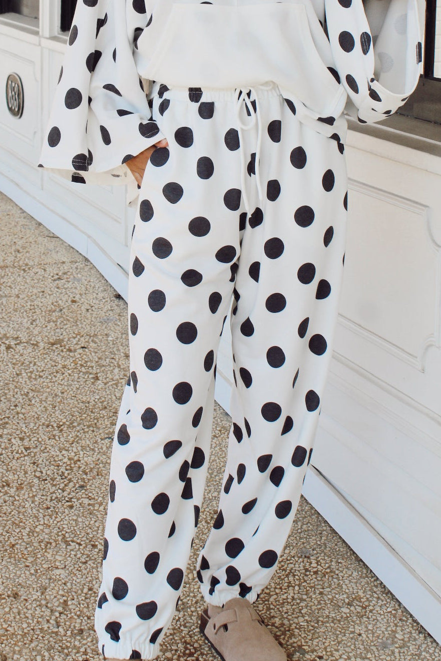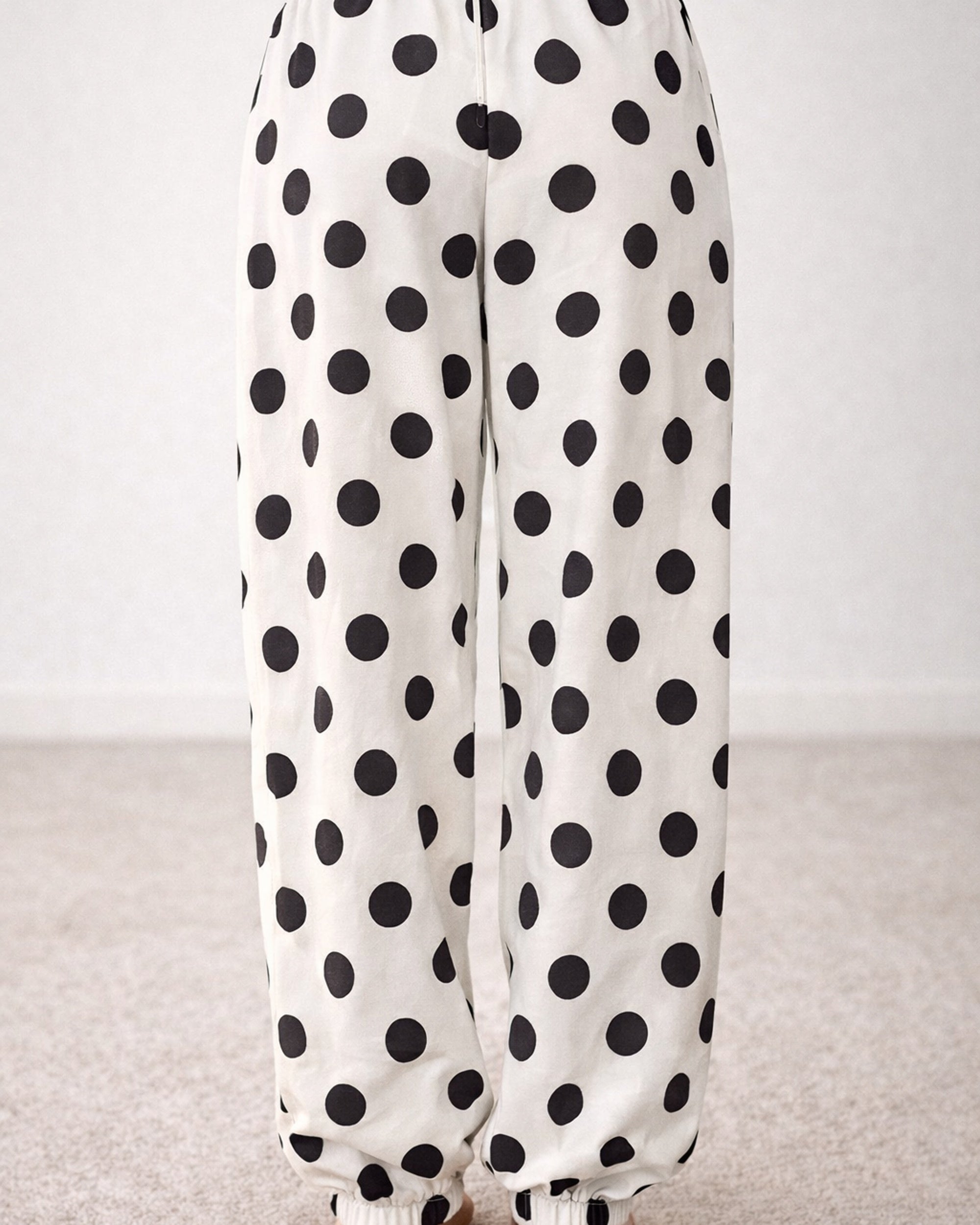 Playful polka dots meet comfort in these charming pants featuring an elastic waist and adjustable string tie at the ankle. The relaxed fit and elastic bottom create the perfect casual silhouette for effortless style. Pair with your favorite tee for a fun, put-together look that works from brunch to errands. Available in classic ivory and black.
