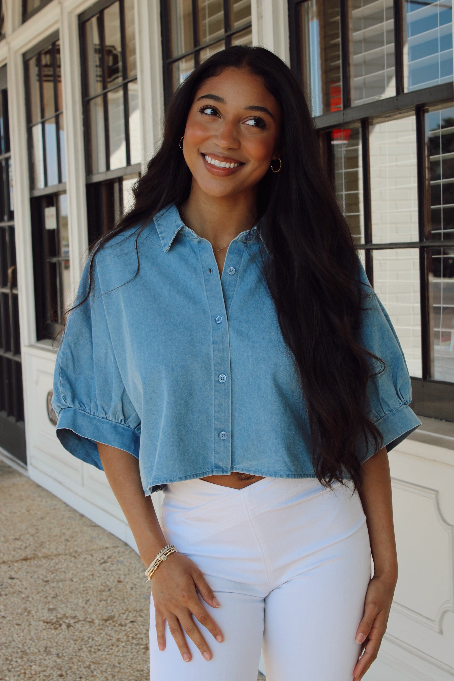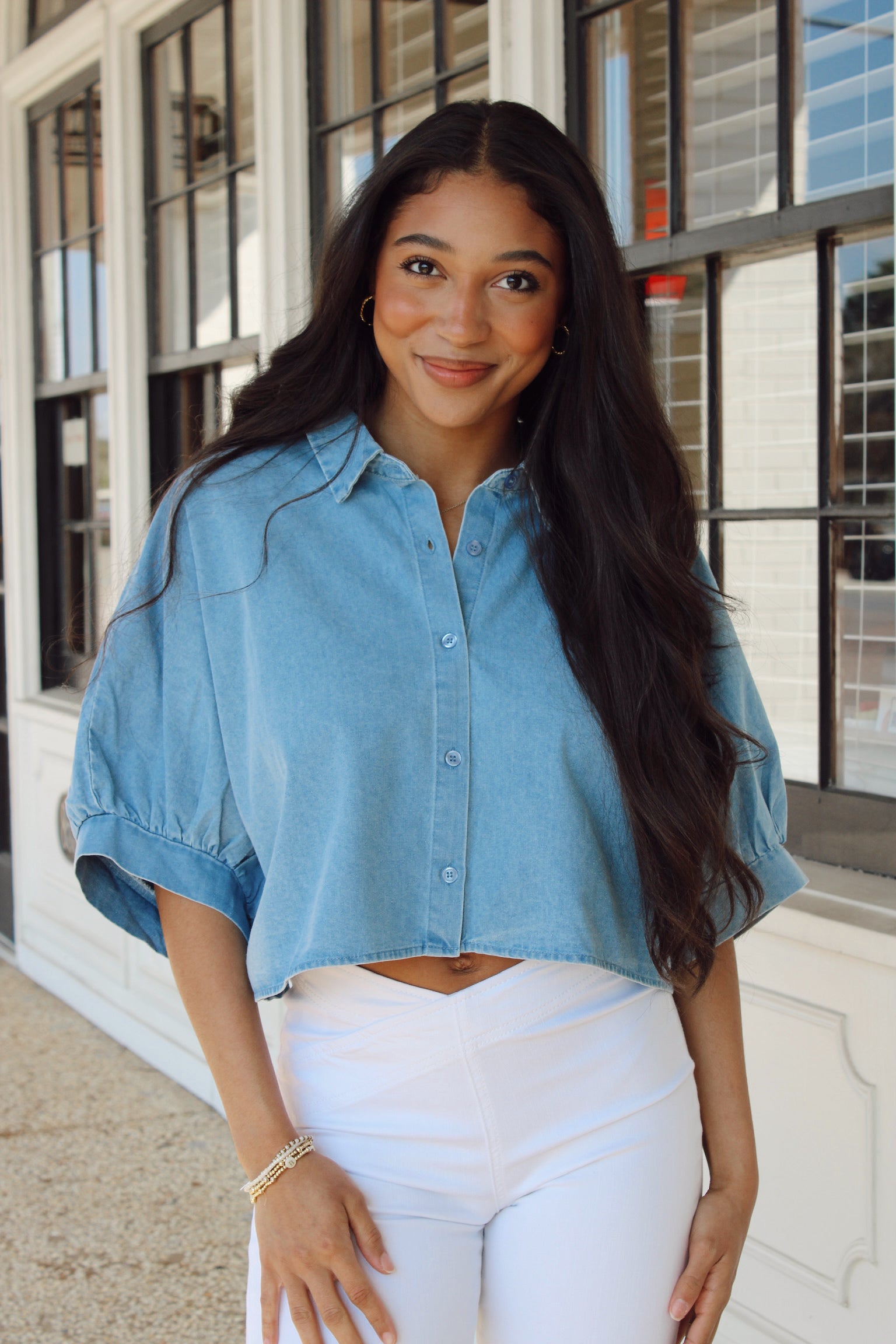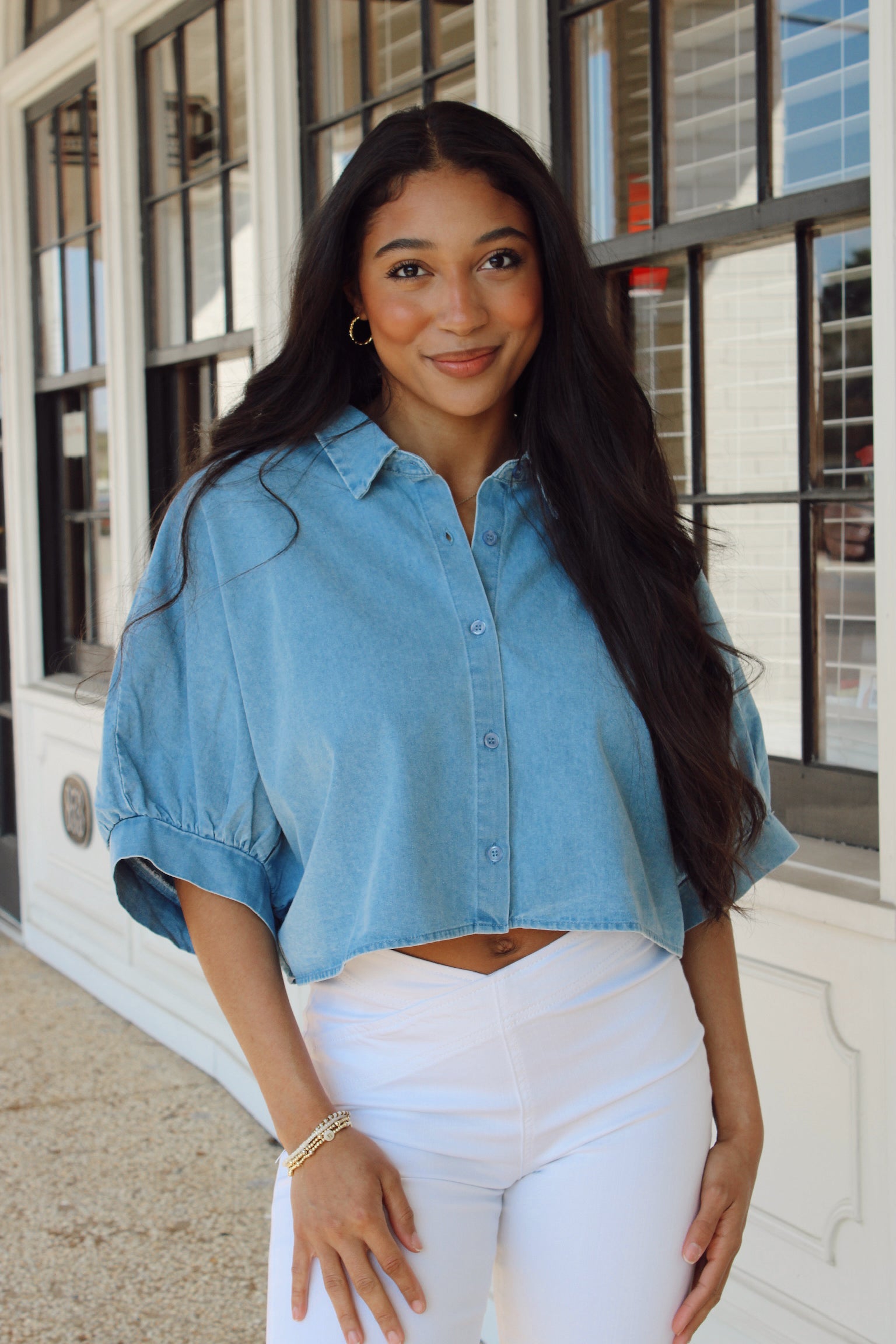 Oversized cropped button-up in crisp light denim—the perfect piece for effortless cool. Throw it on over a tank, tie it at the waist, or wear it solo for that laid-back vibe. Versatile enough for casual Fridays or weekend adventures, this denim top is your new go-to for looking put-together without trying too hard. Classic style with a modern twist.