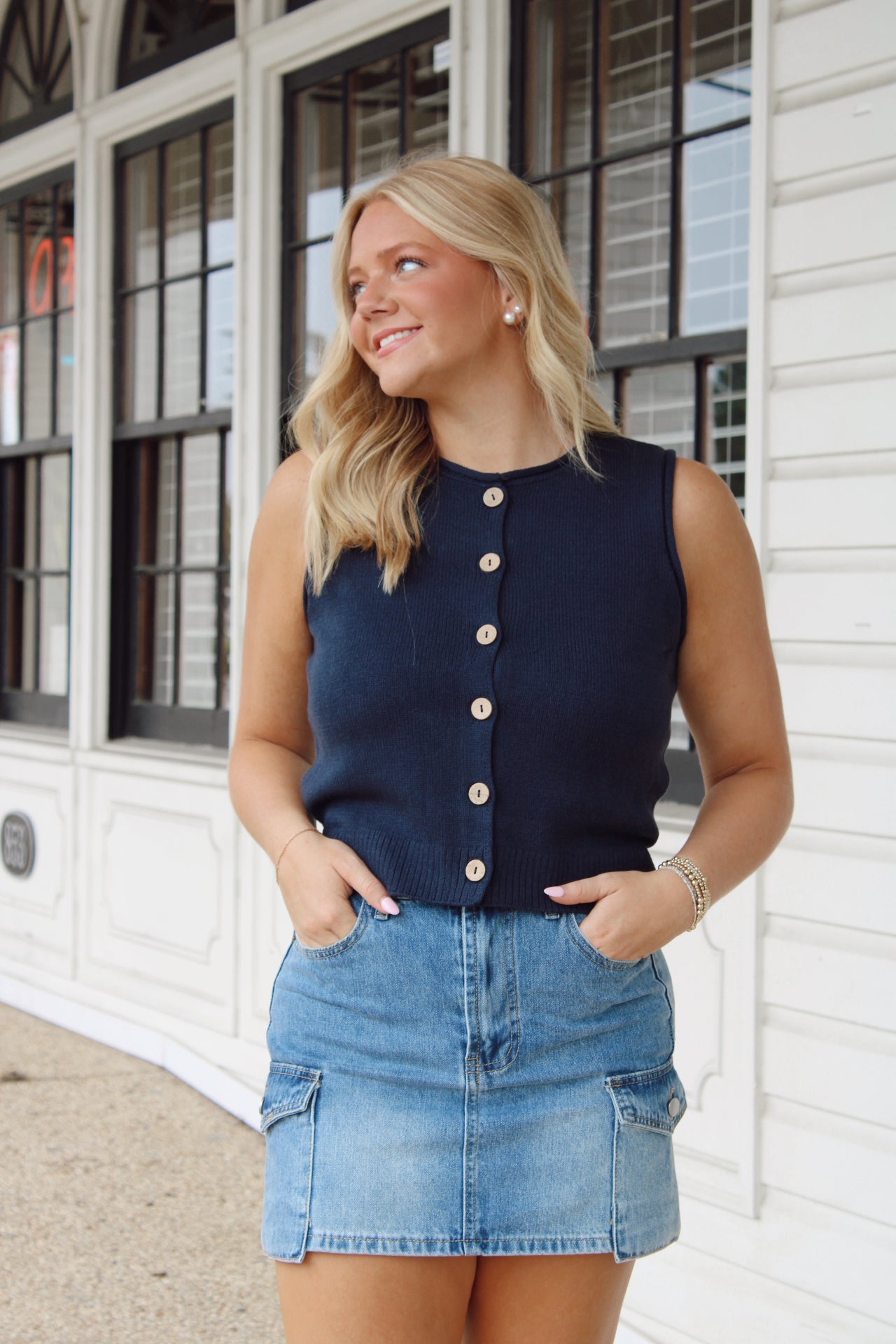 The Scottie Top in navy is a knitted button-up that combines cozy comfort with a touch of playful style. Lightweight yet warm, it's perfect for layering or wearing on its own for a casual, fun look. Whether paired with jeans or skirts, this top adds a cheerful twist to your everyday outfits.