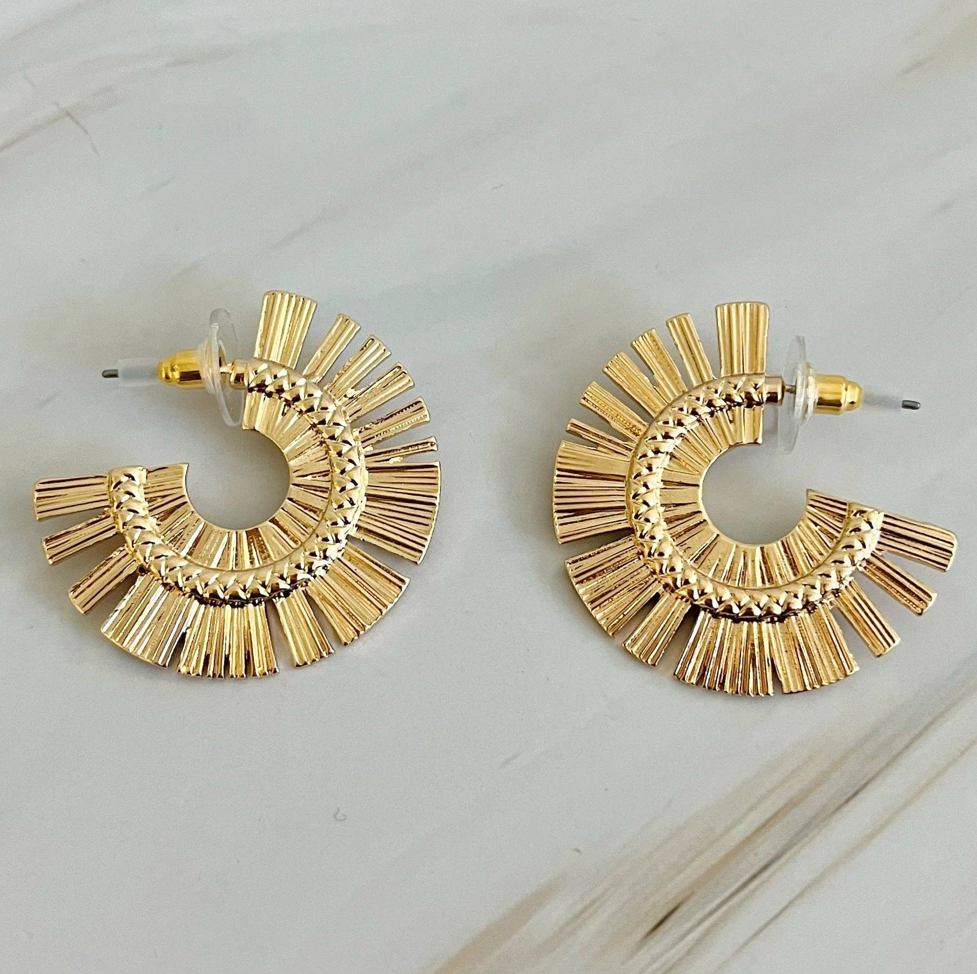 Add a touch of trendy edge to your everyday look with our Sunburst Beauty Hoop Earrings. Featuring a unique design element, these earrings are perfect for any occasion. Elevate your style with these must-have accessories.