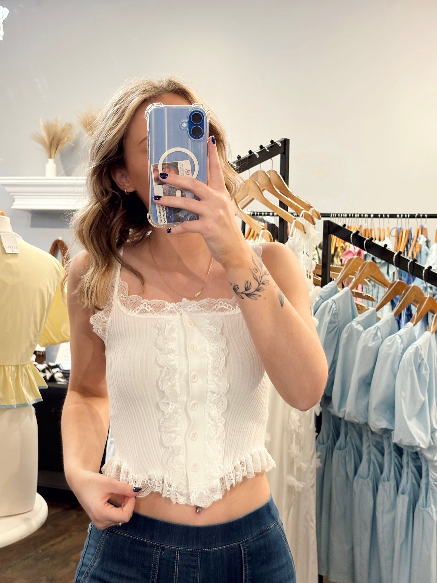 Take a risk and fulfill your fashion wishes with our Wish For It Corset Tank Top! This daring and delicate lace top features a vintage-inspired square neckline, ruffled details, and a ribbed corset bodice for a bold and adventurous look. Its cropped fit adds a touch of challenge to your wardrobe.