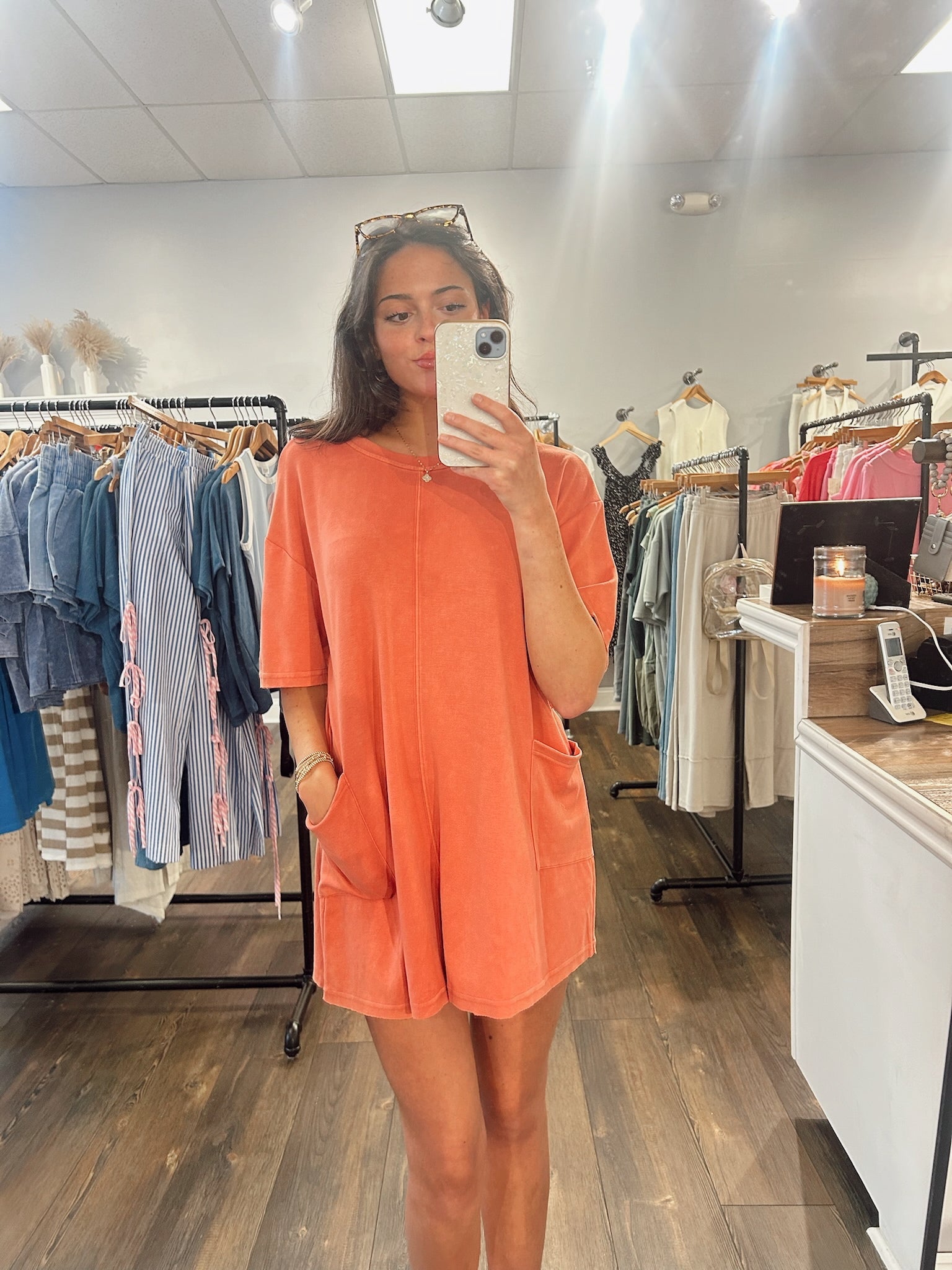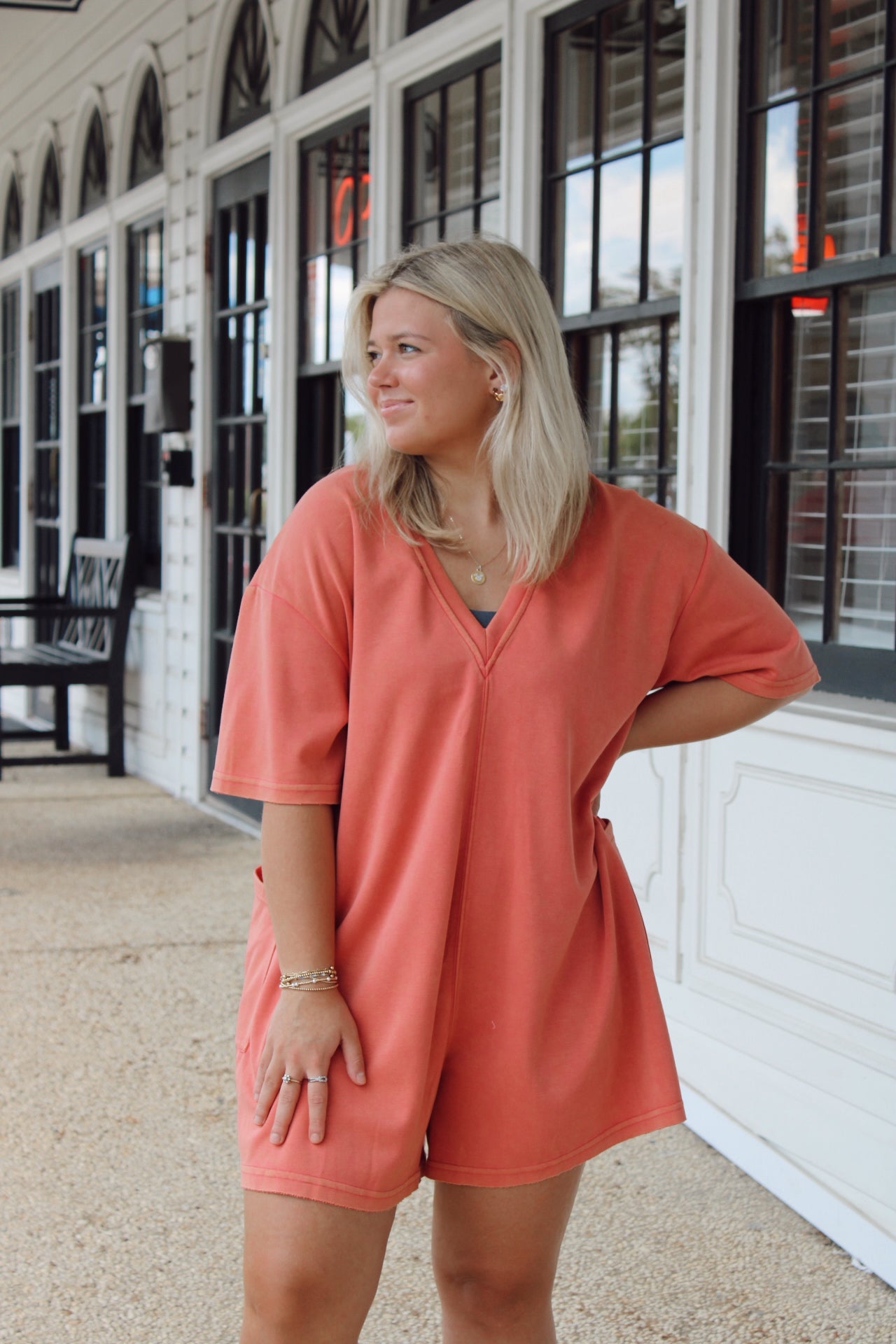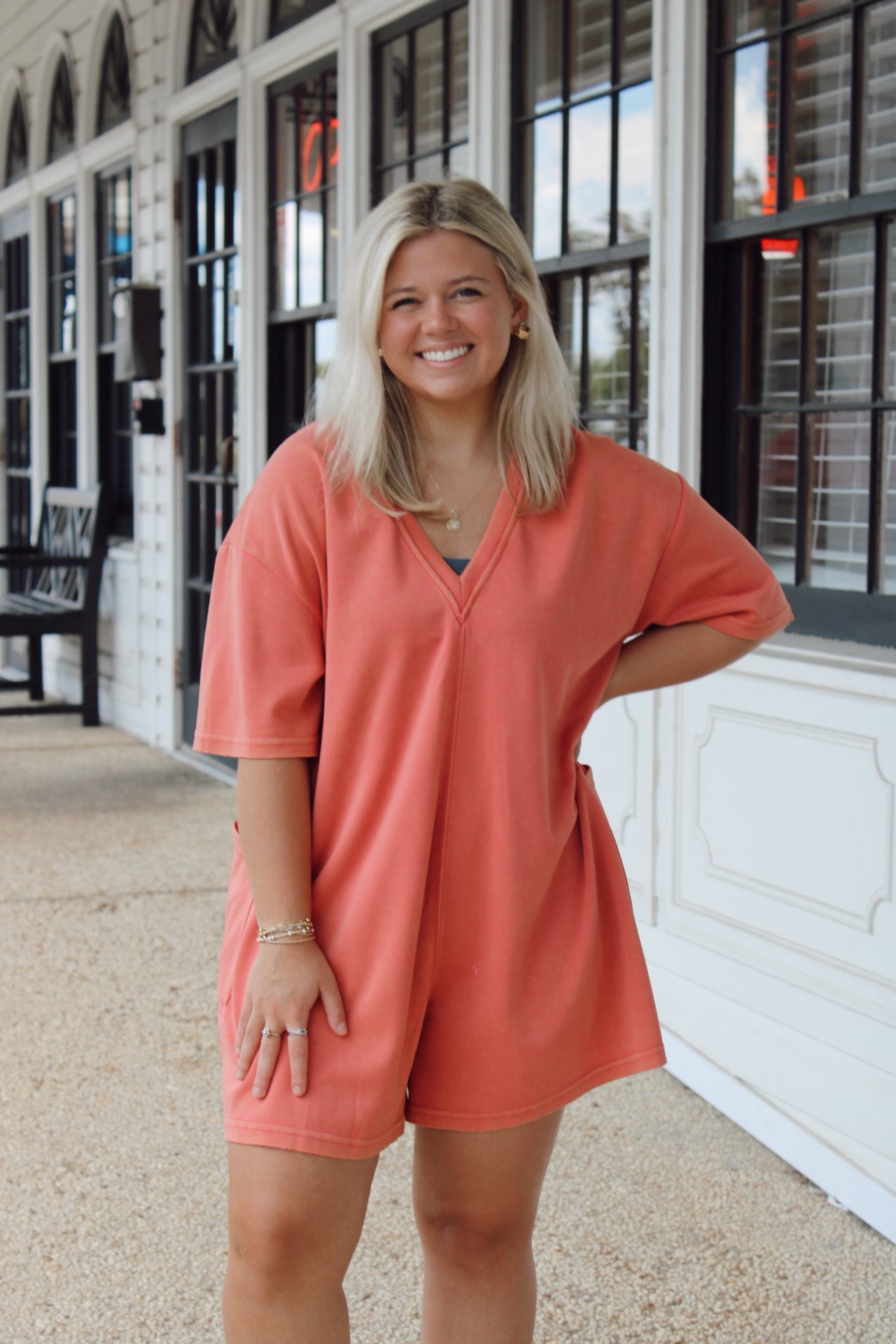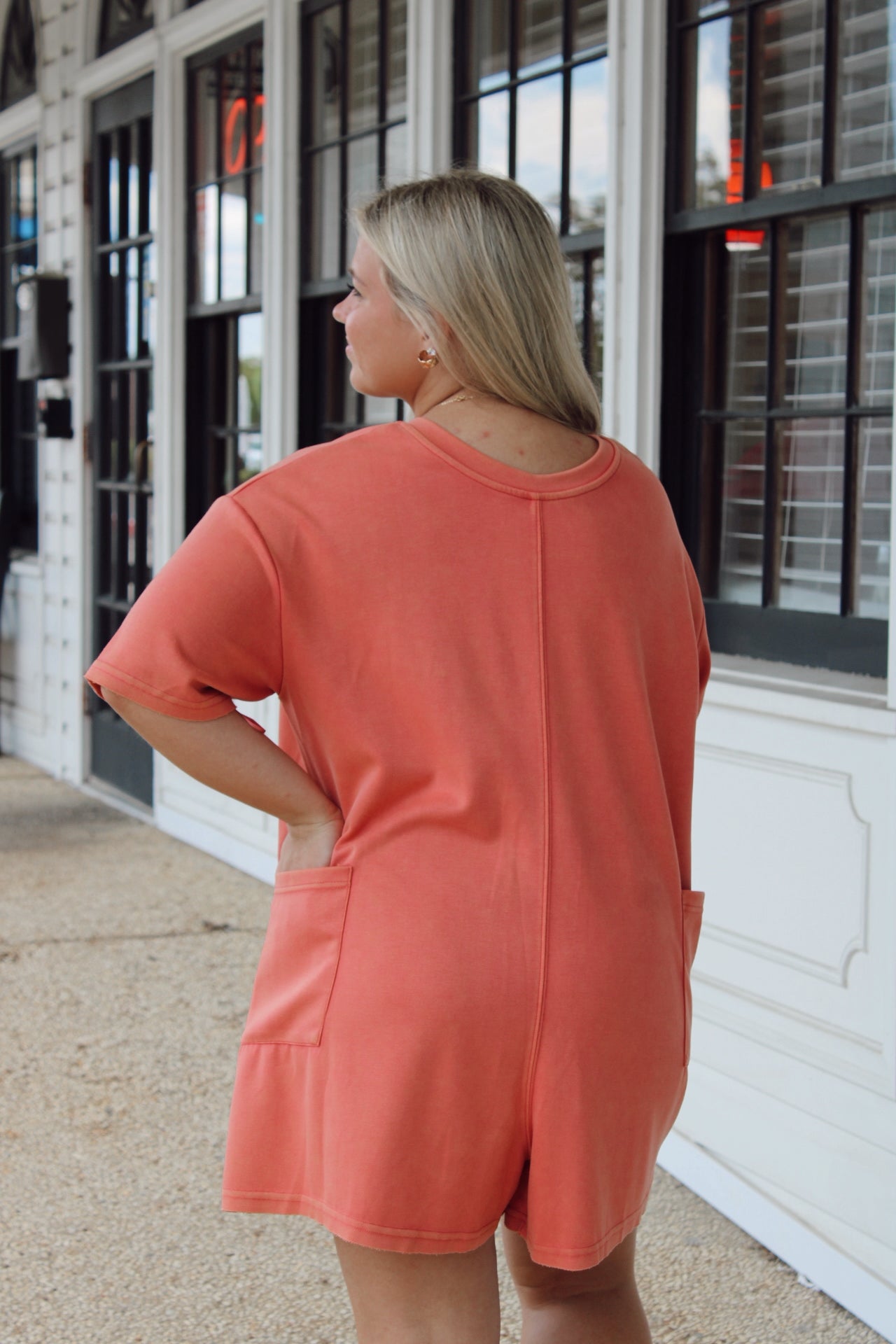 Hear Your Call Patched Pocket Romper/ Coral Orange