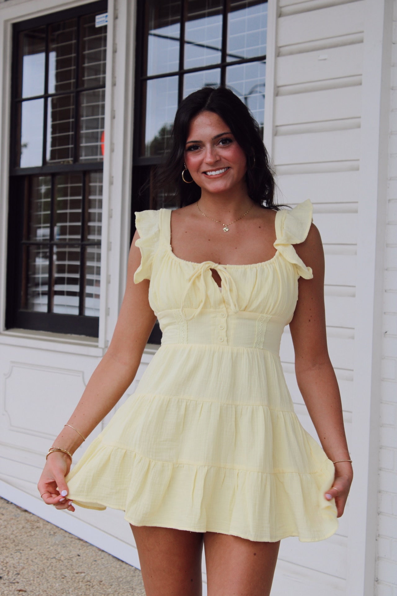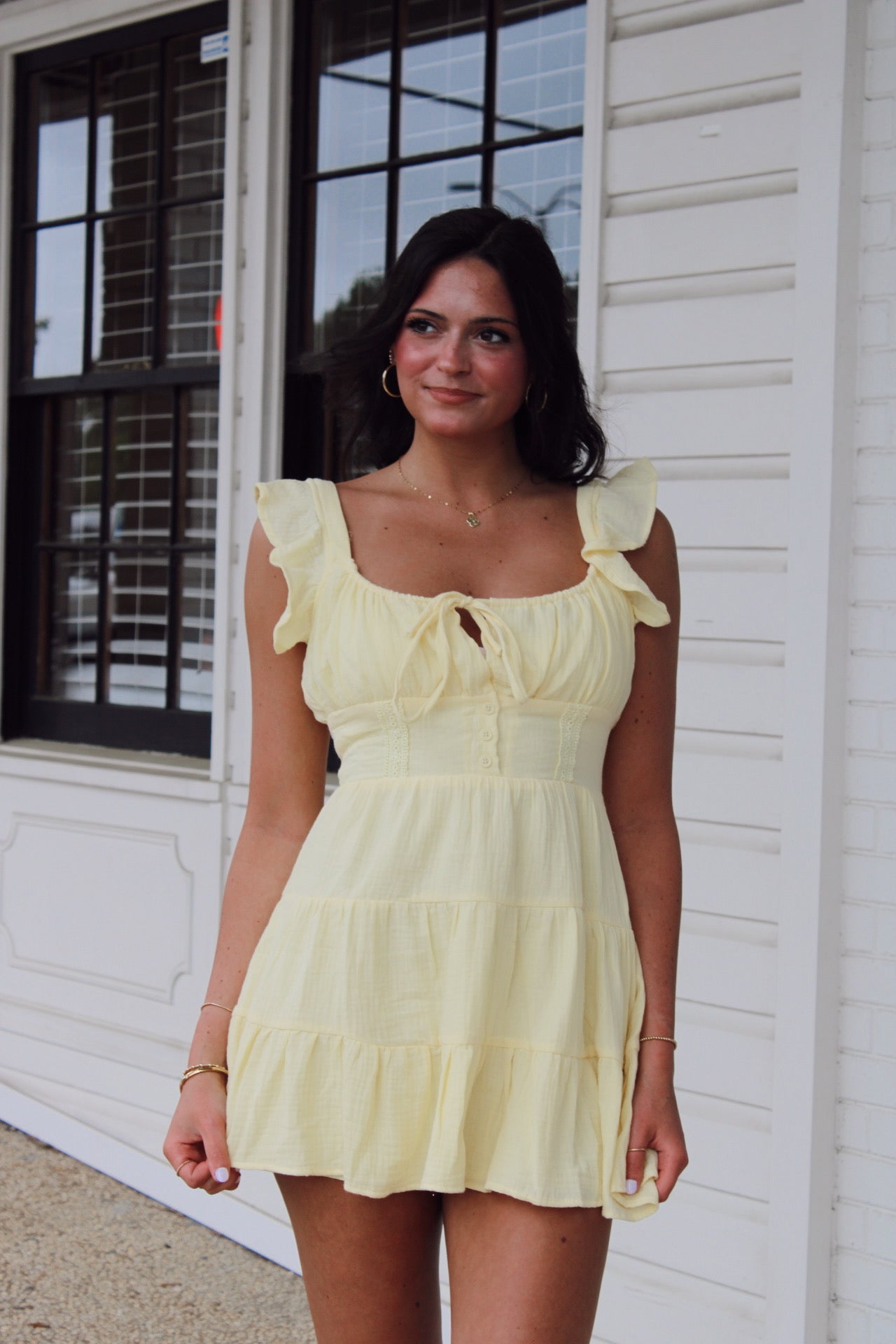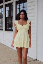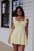 Indulge in luxury with our All The Good Ruffle Shoulder Mini Dress. The delicate lace trim and tiered design add a touch of sophistication to the vibrant lemon color. Elevate your style with the ruffle shoulder detail, perfect for any occasion. Experience the beauty and elegance of this must-have dress.