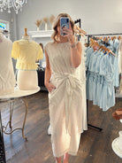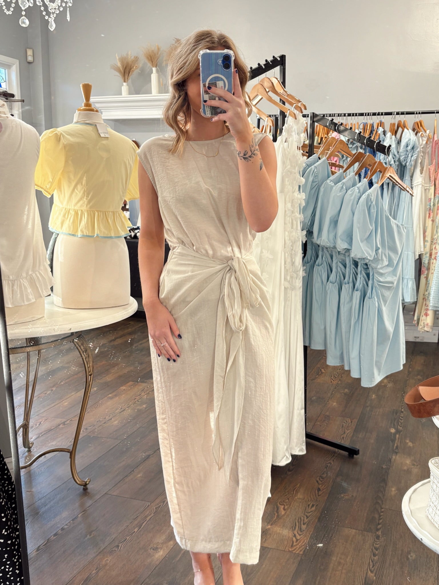 The Better Days Dress in Natural is a midi dress featuring a tied front detail. This versatile dress is perfect for any occasion, providing a flattering fit and chic style. Expertly designed for comfort and elegance, it's the perfect addition to your wardrobe.
