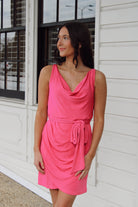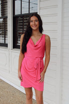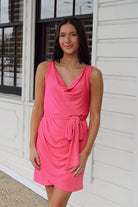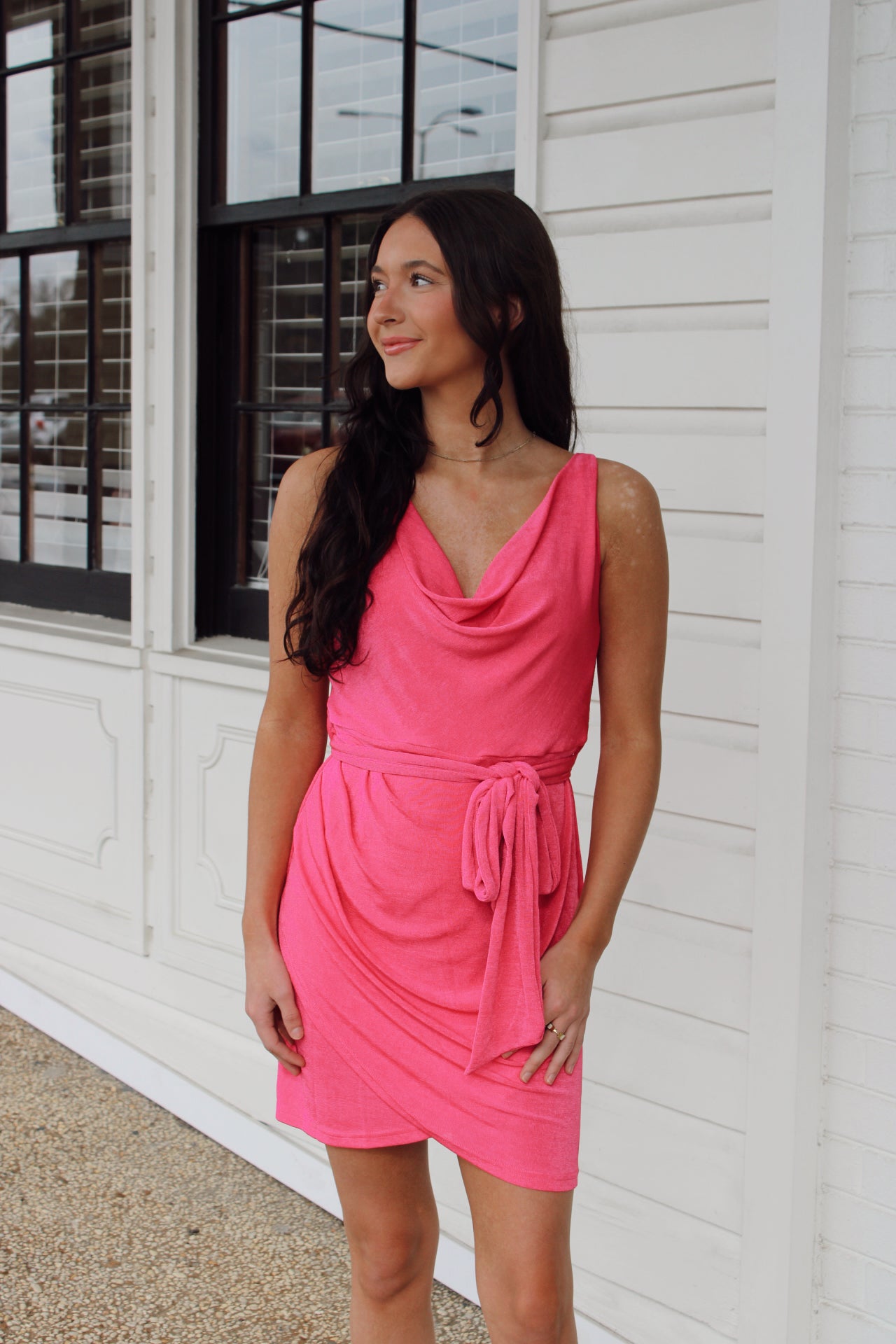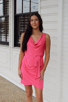 This Candy Pink Dress features a unique cowl neck bodycon design, made with slinky fabric for a sleek and flattering fit. The mini dress also includes self tie detailing for a customizable look. Made with 95% Polyester and 5% Spandex, with a 100% Polyester lining. Expertly crafted for comfort and style.
