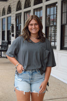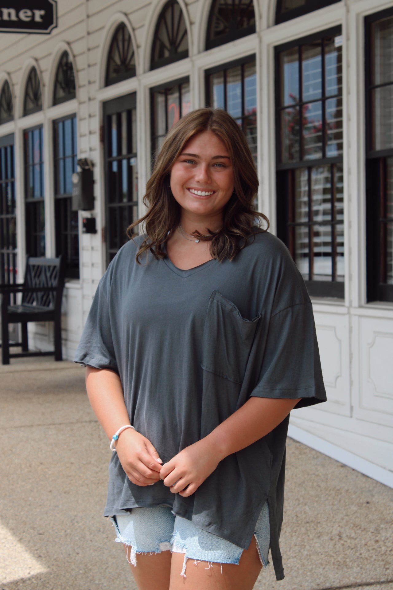 Curvy: Oversized Front Pocket Raw Edge Top/ Ash Grey