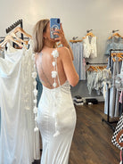 Flaunt your daring nature with our Garden Wedding Maxi Dress in Ivory. Flowing satin fabric, 3D flower straps, and a charming cowl neck create an ethereal look. Perfect for an adventurous and romantic outdoor wedding. Say "I do" in style!