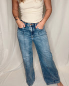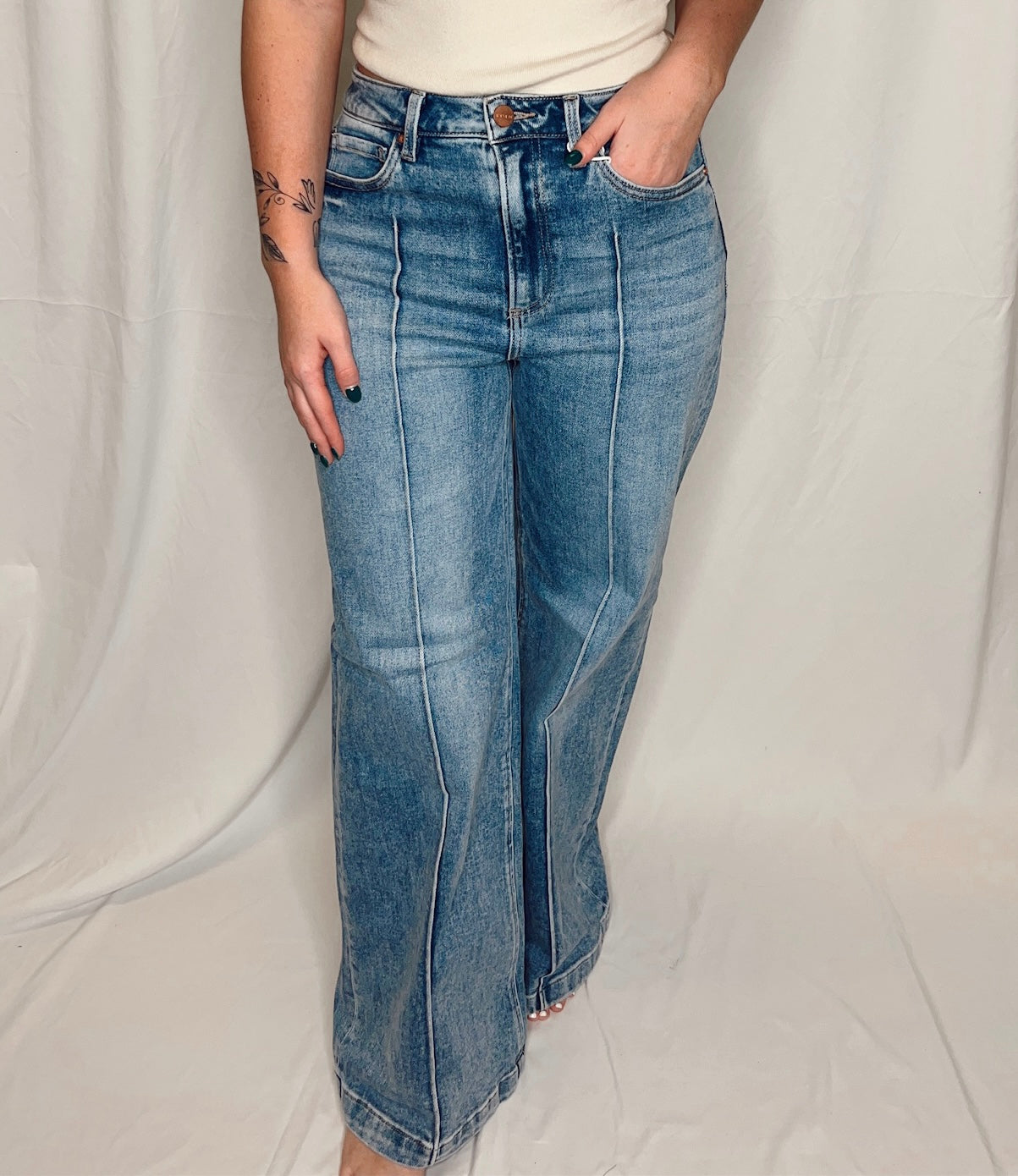 High Waist-Wide Leg- Pintuck Detailed Jeans/ Medium Wash