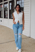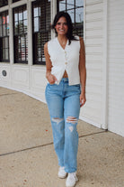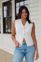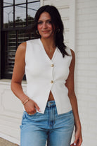 Introducing the It's Your Day V-Neck Vest in elegant white. This sophisticated piece features a classic V-neck and luxurious gold button closure, perfect for elevating any outfit. Exude an air of exclusivity and elegance with every wear.