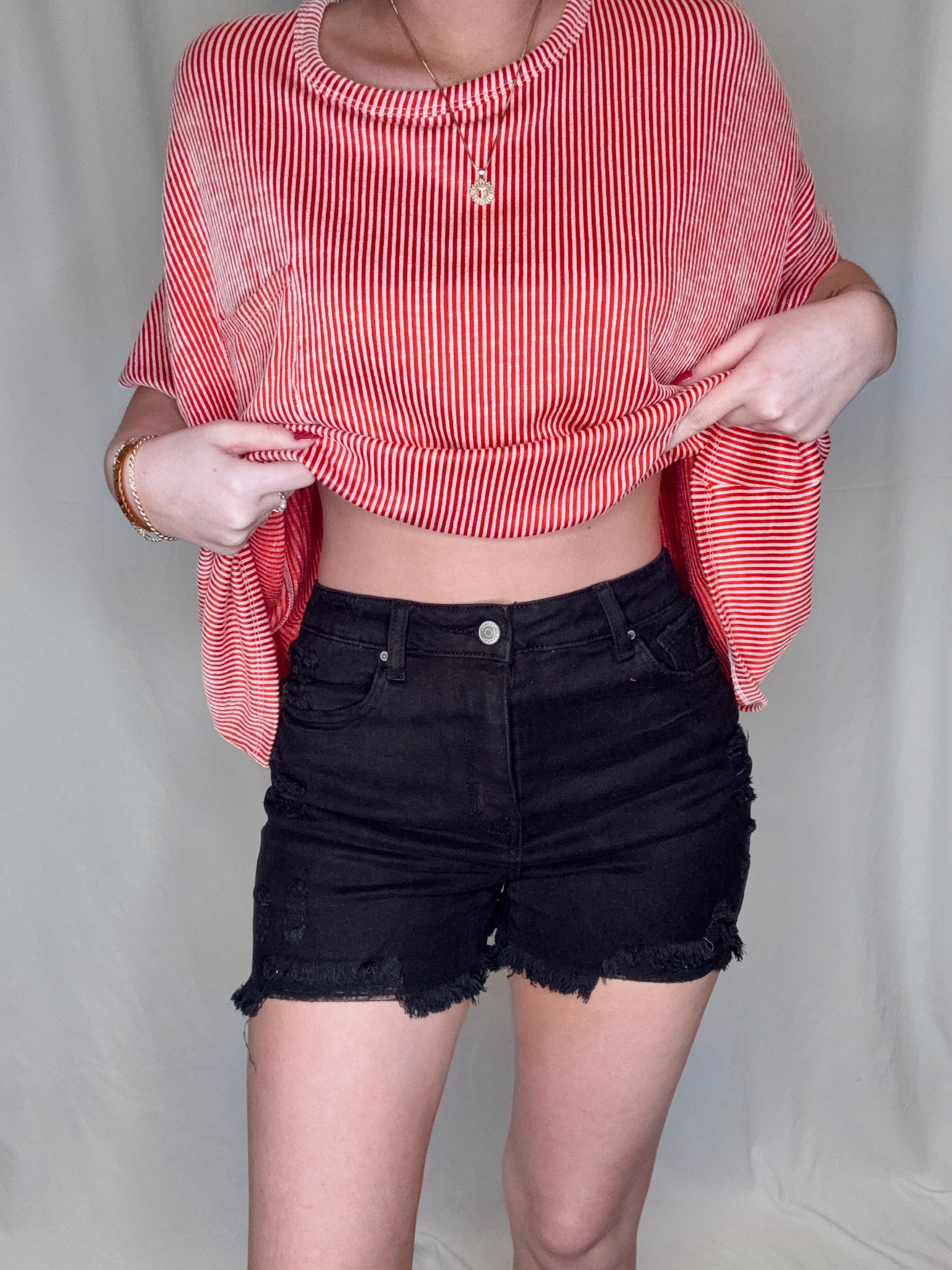 Add a touch of edginess to your summer wardrobe with our Mallory Shorts! Featuring distressed raw hem details, these shorts are perfect for creating a cool and effortless look. Pair with a graphic tee and sneakers for the ultimate street style vibe. Order now and step up your fashion game!