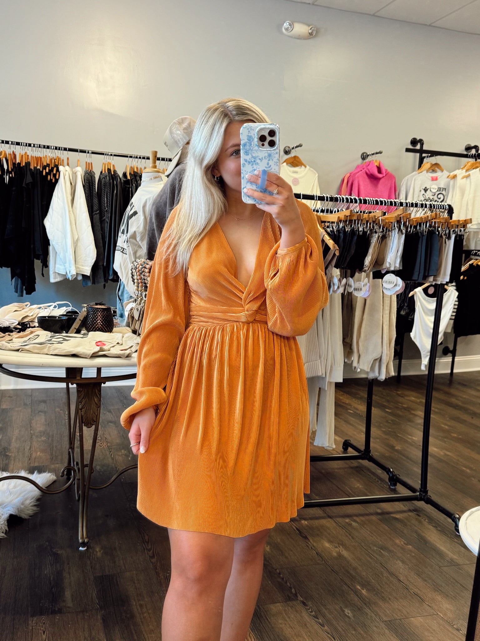 This stunning Pumpkin Spice Dress/ Topaz is the perfect addition to your wardrobe. The deep V-neckline elegantly showcases your decolletage while the dramatic balloon sleeves add a touch of romance. The knotted detail at the waist creates a flattering silhouette, and the flowy pleated fabric offers movement and grace for any special occasion.