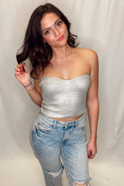 Add a touch of shine to your wardrobe with our Shine Bright Top in silver. This playful tube top features a unique metal coating that will make you stand out in any crowd. Perfect for a night out or a fun event, this top is sure to turn heads. Shine on, fashionista!
