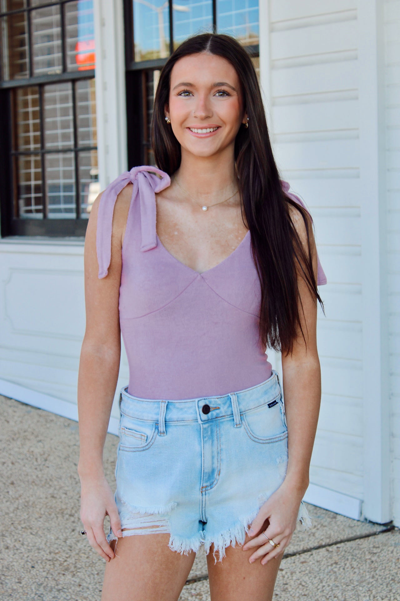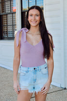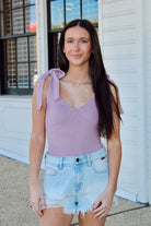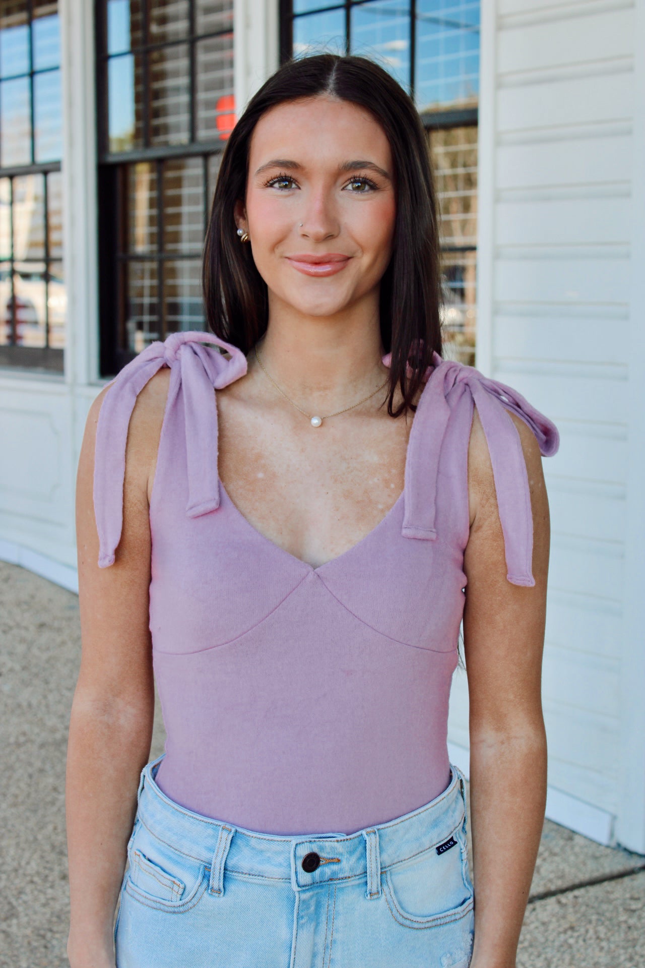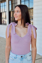 Get tied down in style with our Tie Me Down bodysuit! Featuring a unique strap tie design and soft fabric, this bodysuit is perfect for a day out or a night in. Let our Lavender color add a pop of fun to your wardrobe. (Strap into this soft bodysuit and get ready to turn heads - or your partner's head!)
