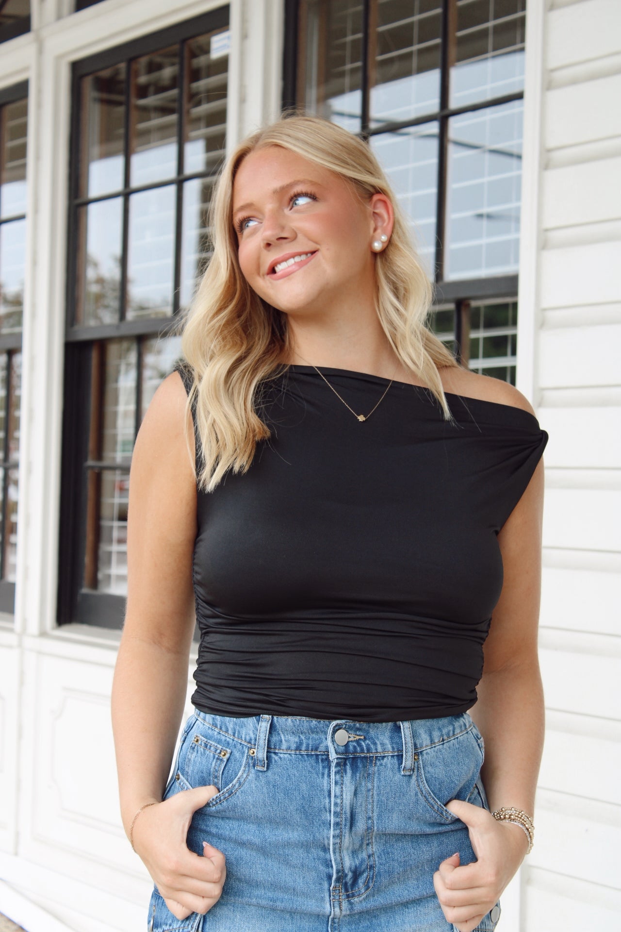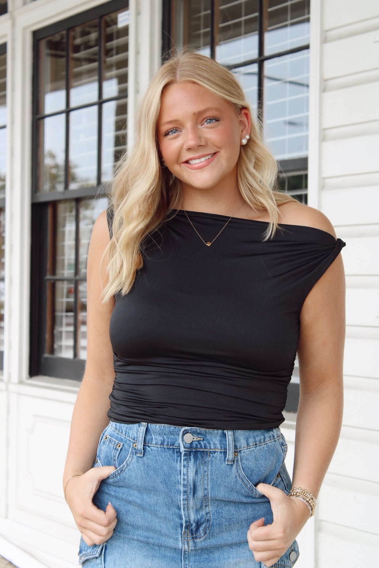 The Amelia Top in Black offers a sophisticated asymmetrical off-the-shoulder silhouette that elevates any outfit with modern elegance. Crafted for a flattering fit, this top highlights one shoulder while maintaining balance and style. Its clean ivory hue makes it versatile for both casual and dressier occasions, ensuring a refined yet contemporary look. Ideal for those seeking a statement piece with expert-tailored design and effortless chic.