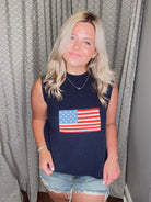 Looking for the perfect summer top? Look no further! Our Here You Are Flag Print Top is the perfect blend of comfort and style. Made from a soft, knitted material, this sleeveless sweater features a fun and patriotic flag print that is sure to turn heads. Perfect for any occasion, you'll love wearing this top all season long!