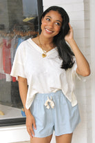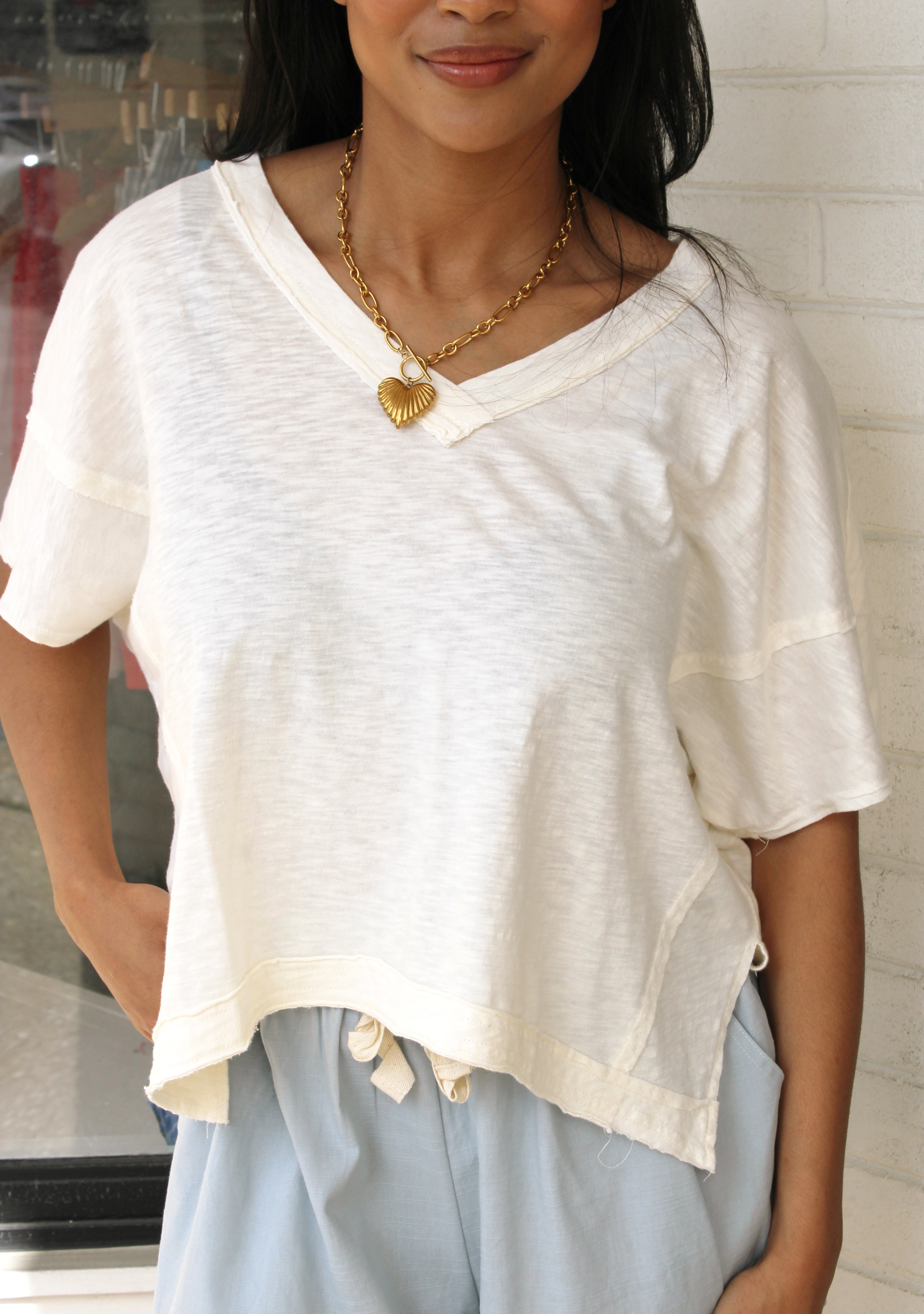 Meet the Pia Oversized Top—your new go-to for laid-back style with personality. This acid-washed cotton beauty rocks a fun V-neck, breezy short sleeves, and a cheeky side slit that keeps things interesting. The cropped length and raw edge seams give it that cool, handcrafted vibe that feels anything but basic. Throw it on with your favorite jeans and watch heads turn. Comfy, quirky, and totally you.
