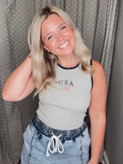 Get ready for some stateside style with our USA Cropped Tee! This sleeveless ribbed crop top boasts a fun and flirty look, perfect for any adventure. And with a subtle nod to the good ol' US of A, you'll be showing off your patriotic side in style. (Freedom never looked so fashionable! 🇺🇸)
