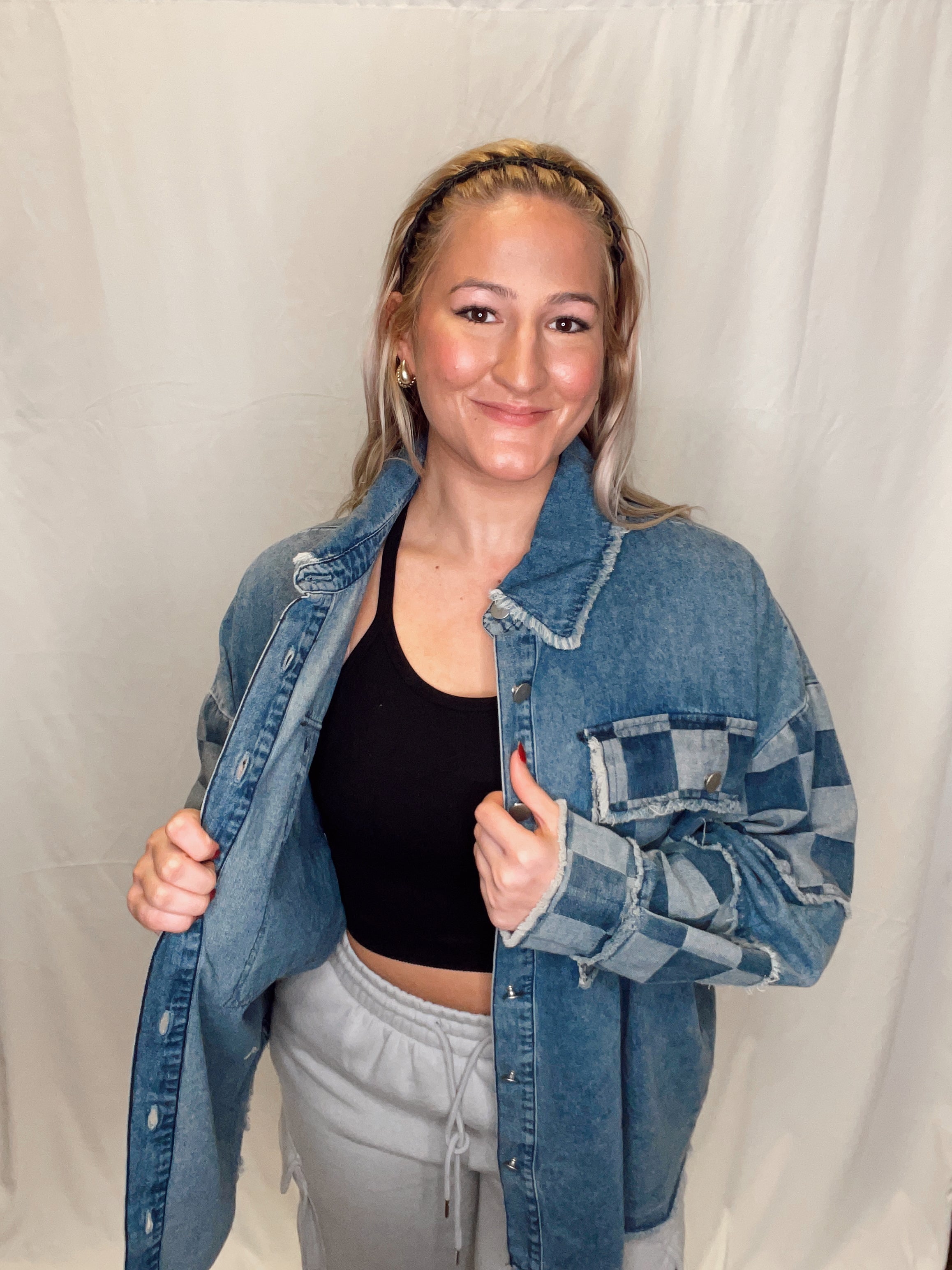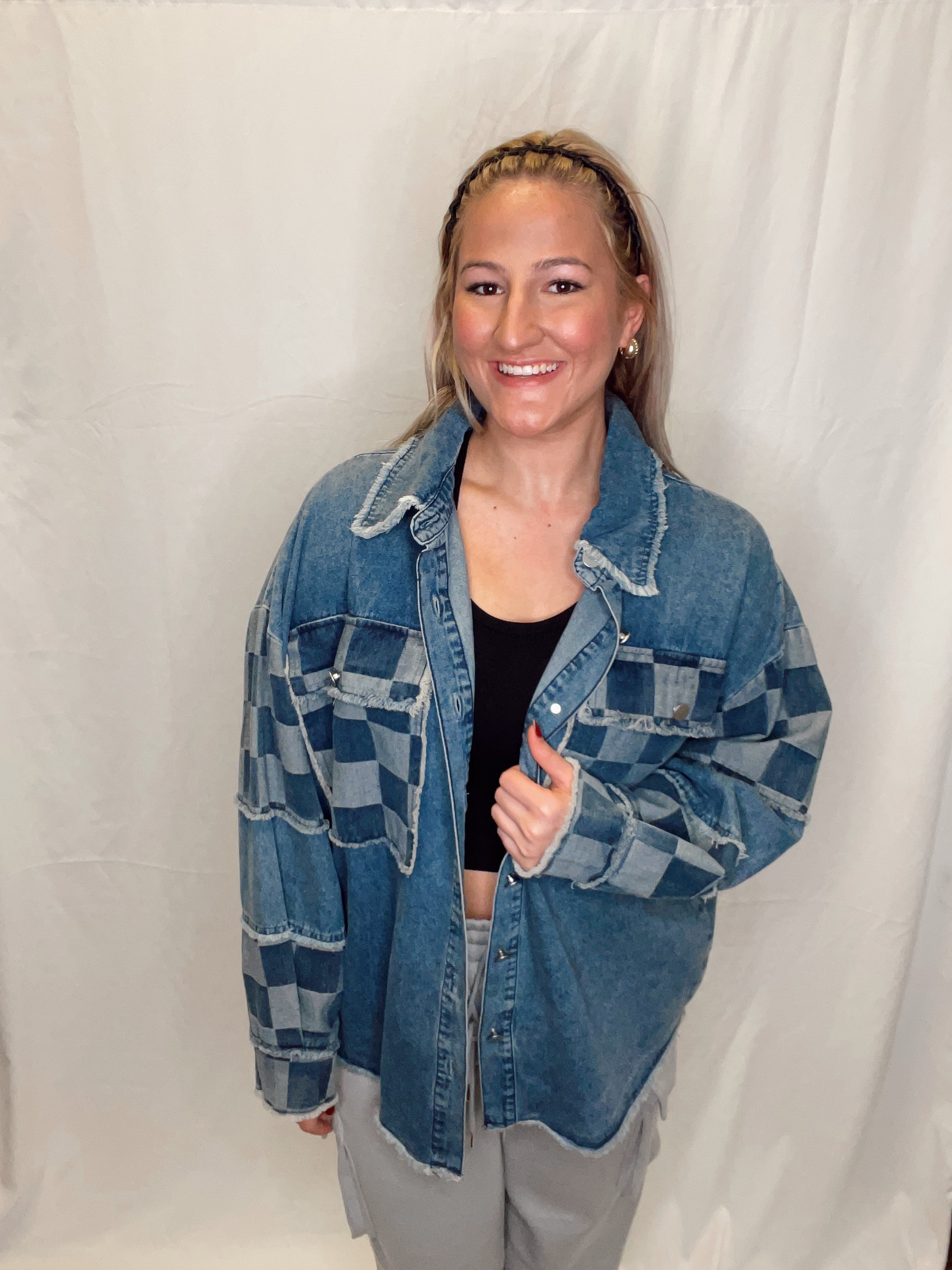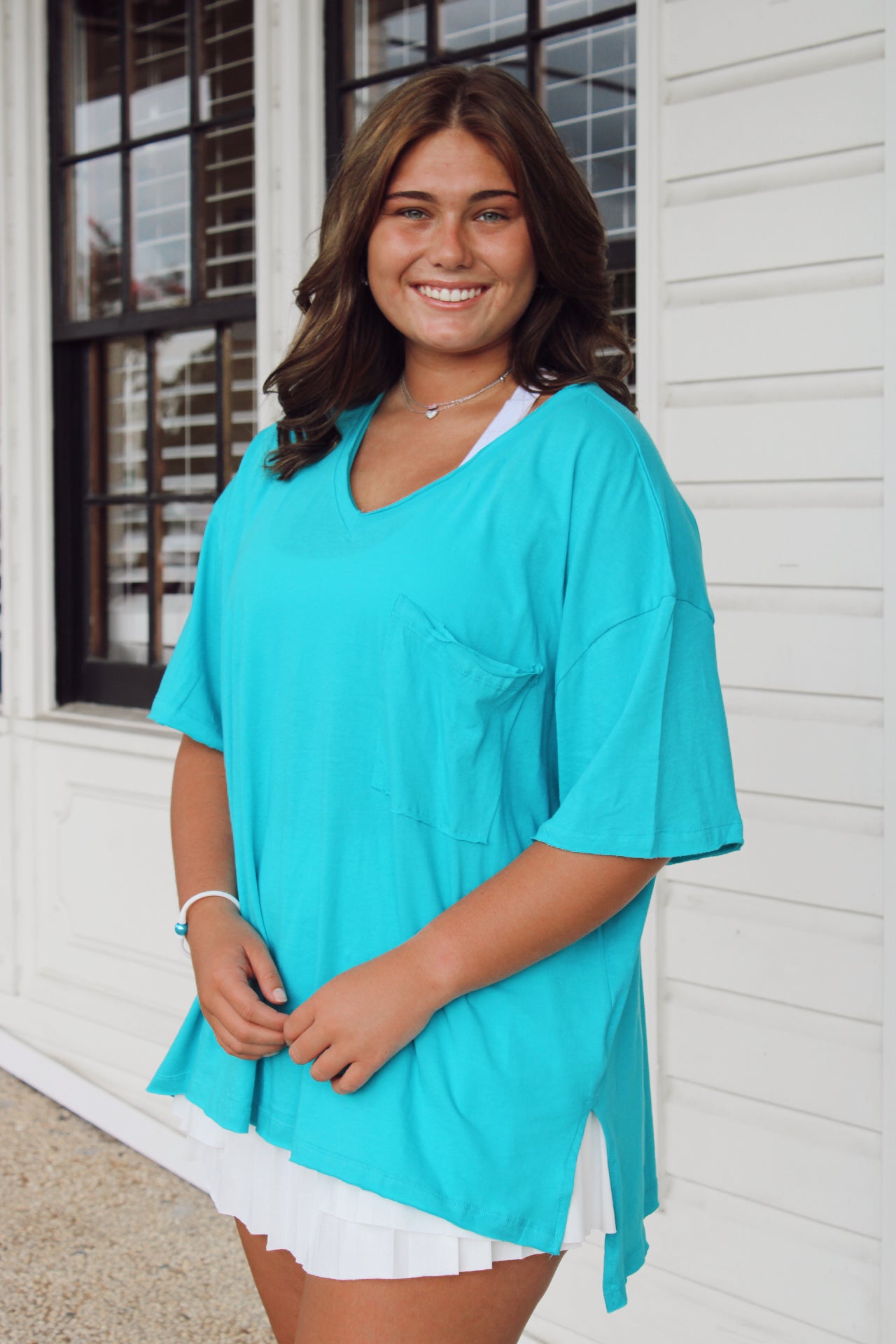 Curvy: Oversized Front Pocket Raw Edge Top/ Ice Blue