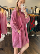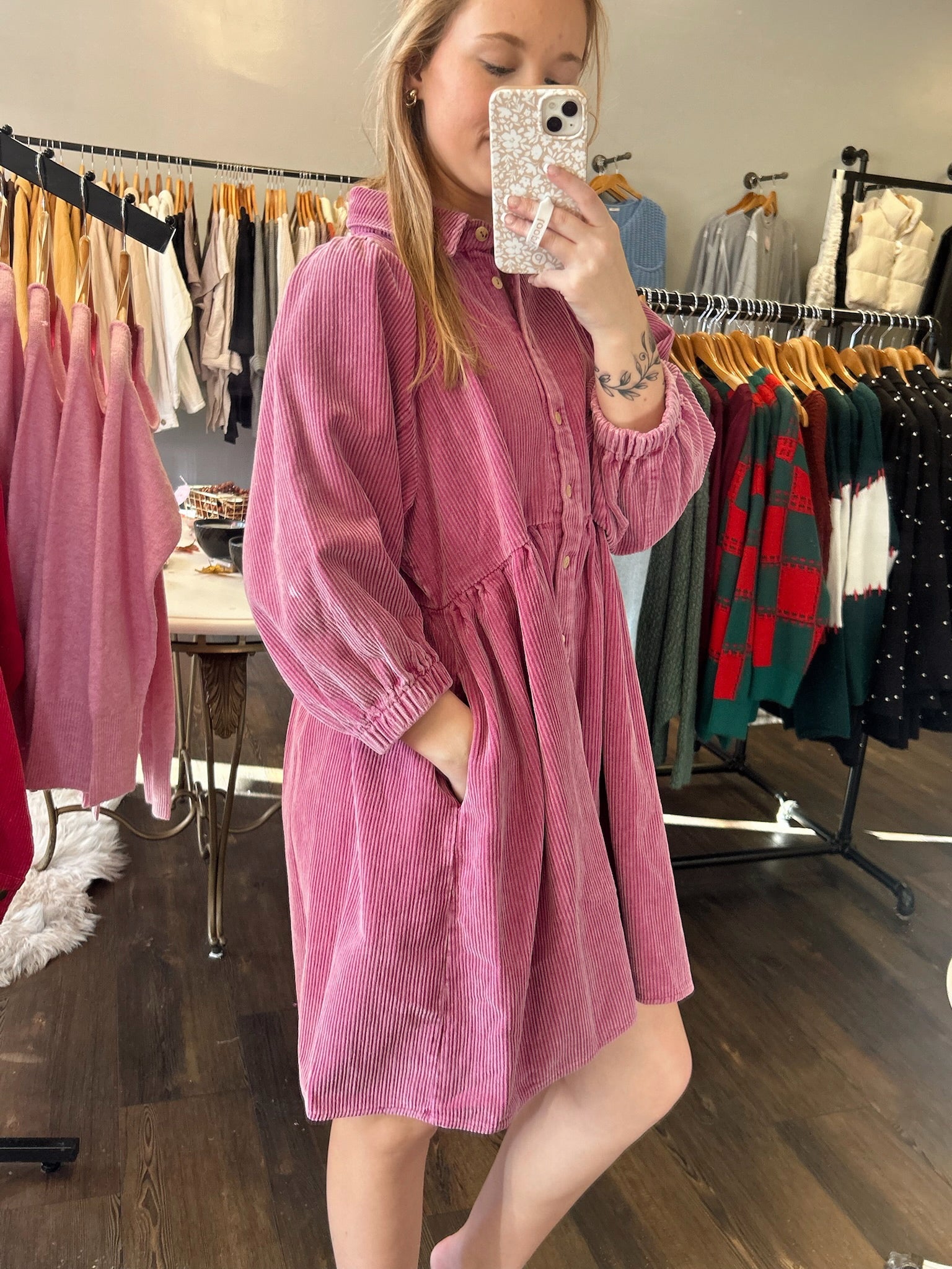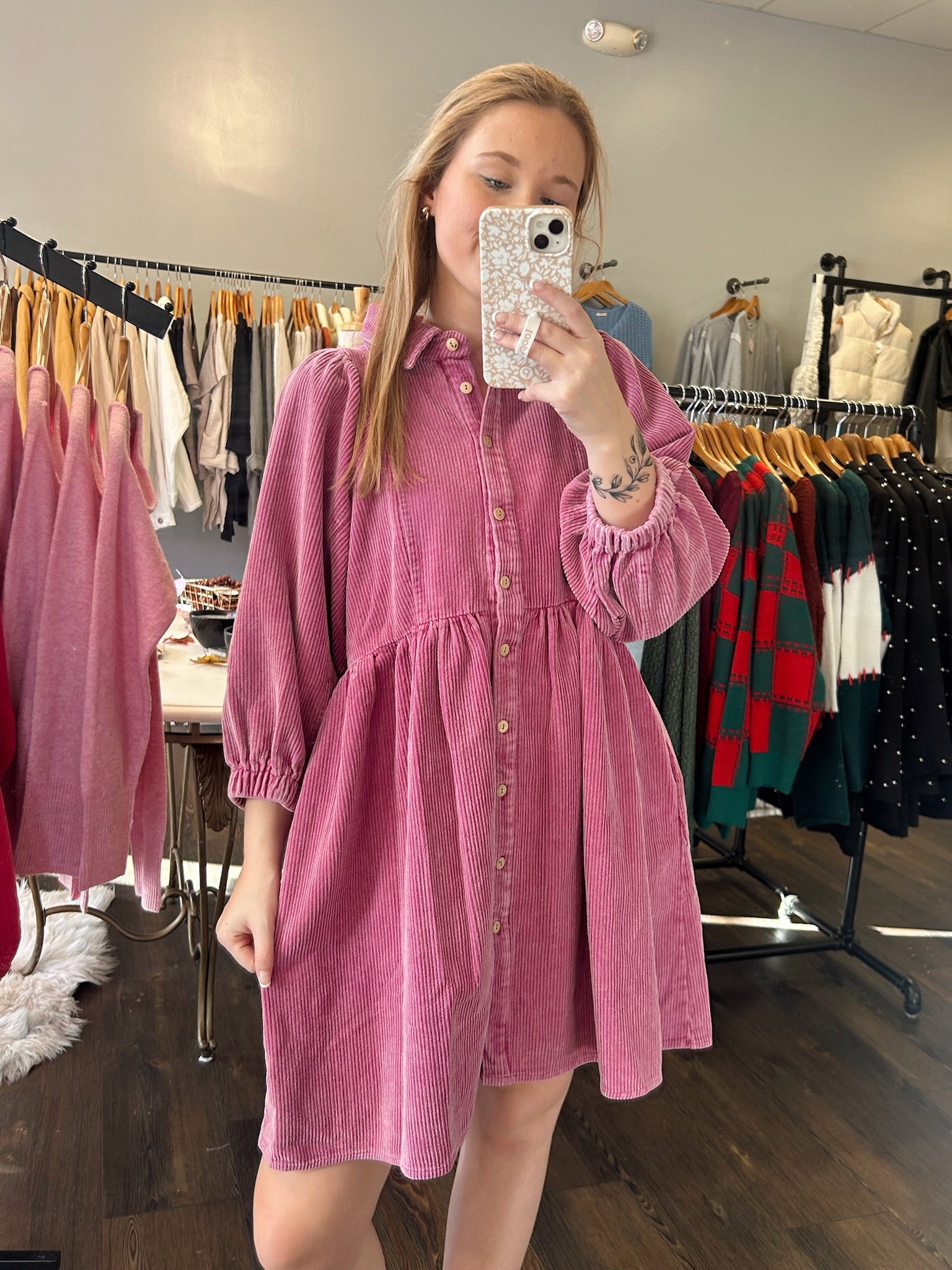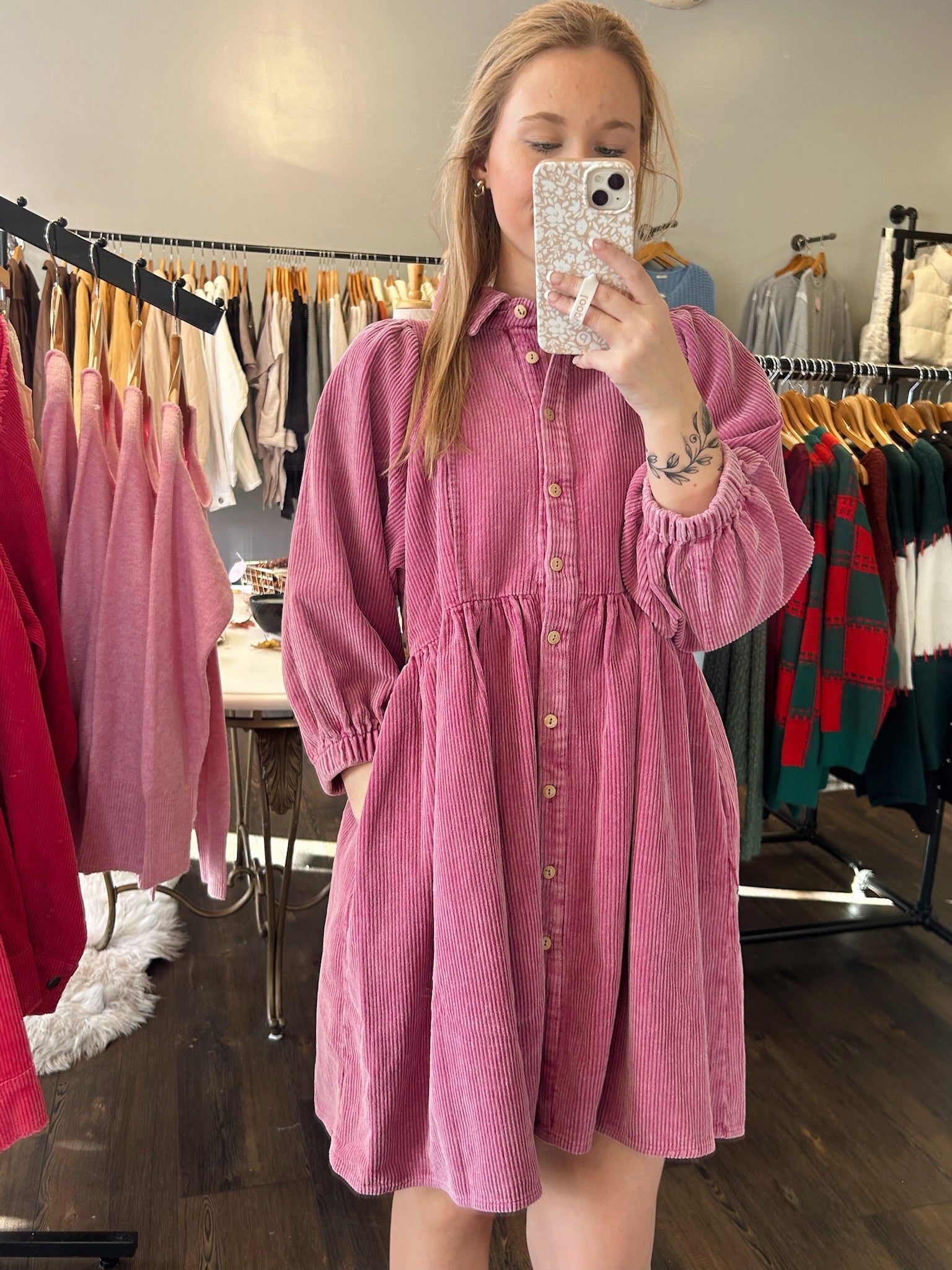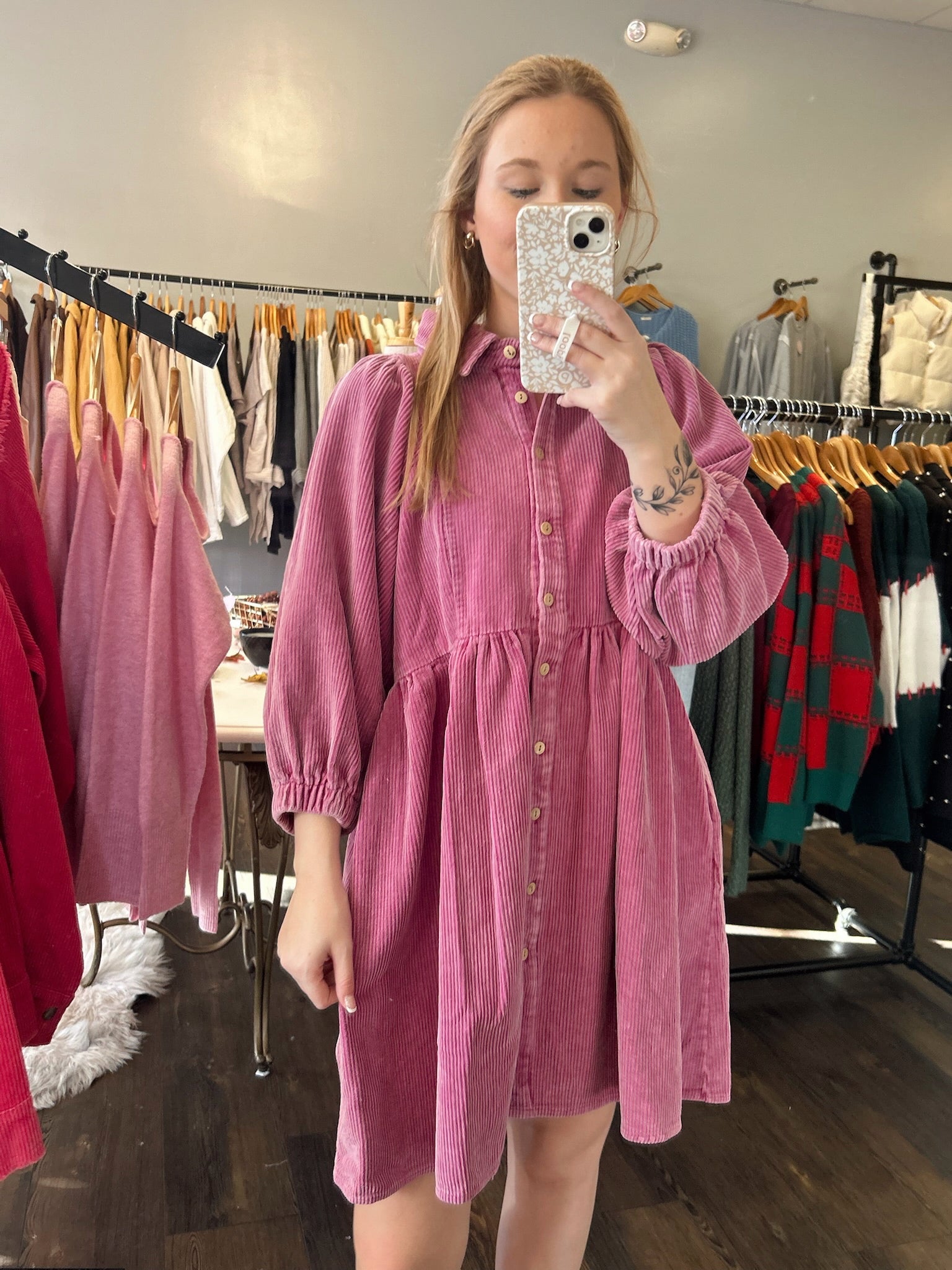 Know Me Dress: Get noticed in this playful Berry-colored corduroy dress with a button-down front and convenient side pocket. Washed for ultimate softness. Perfect for a day out or a casual date (wink wink).
